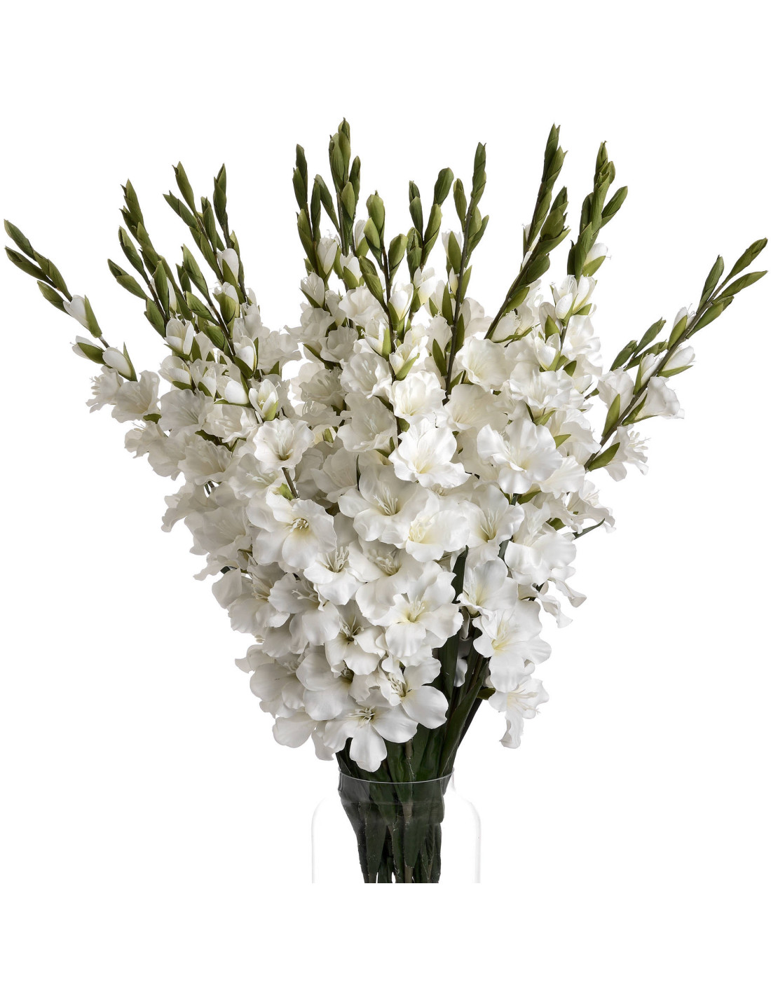 For a dramatic statement arrange them solo in a tall clear vase showcasing their full height and beauty. These white gladioli work wonderfully in various settings from boutique hotels to homes. Their neutral white colour allows easy integration into diverse schemes and seasonal displays a must-have for discerning clientele.
