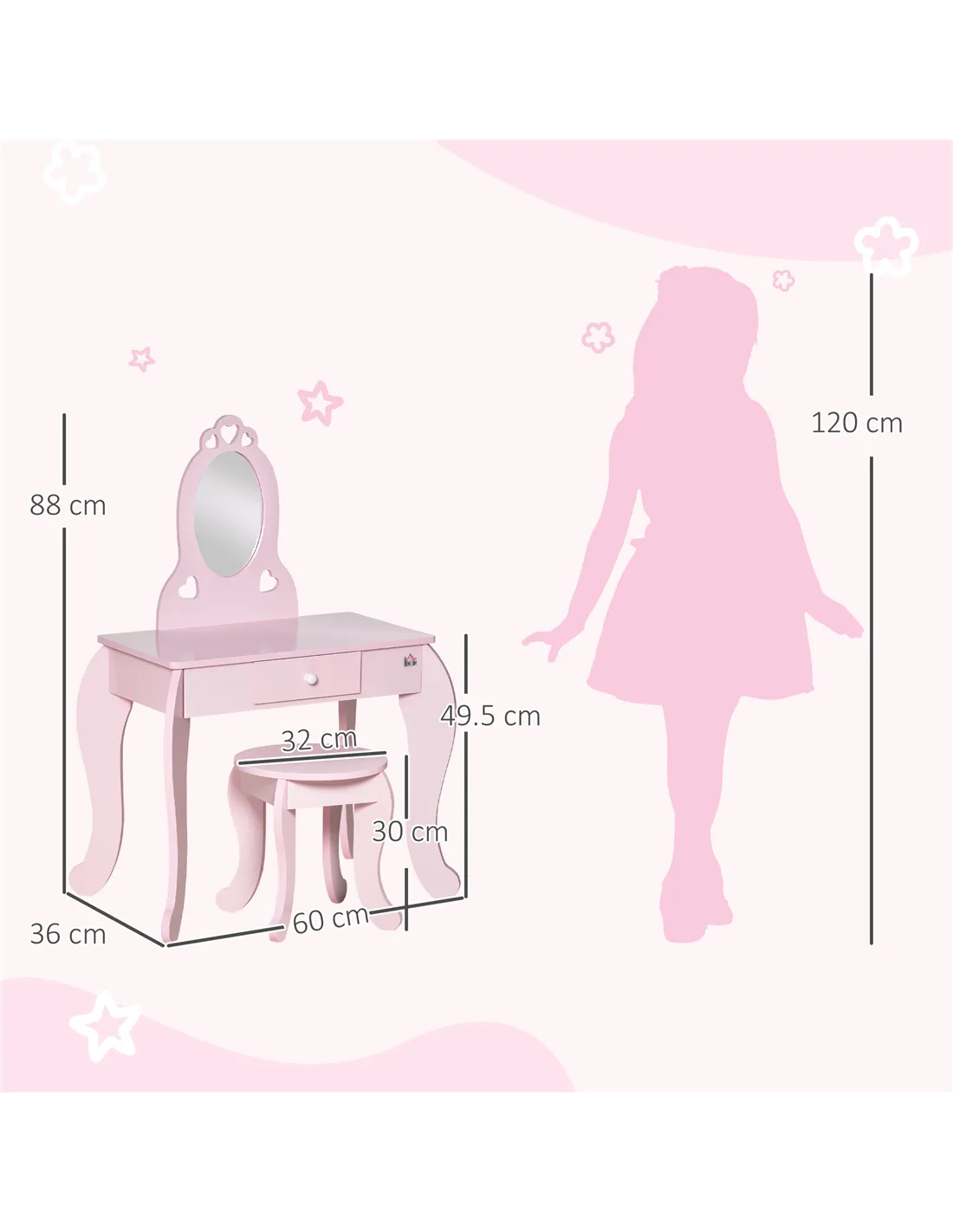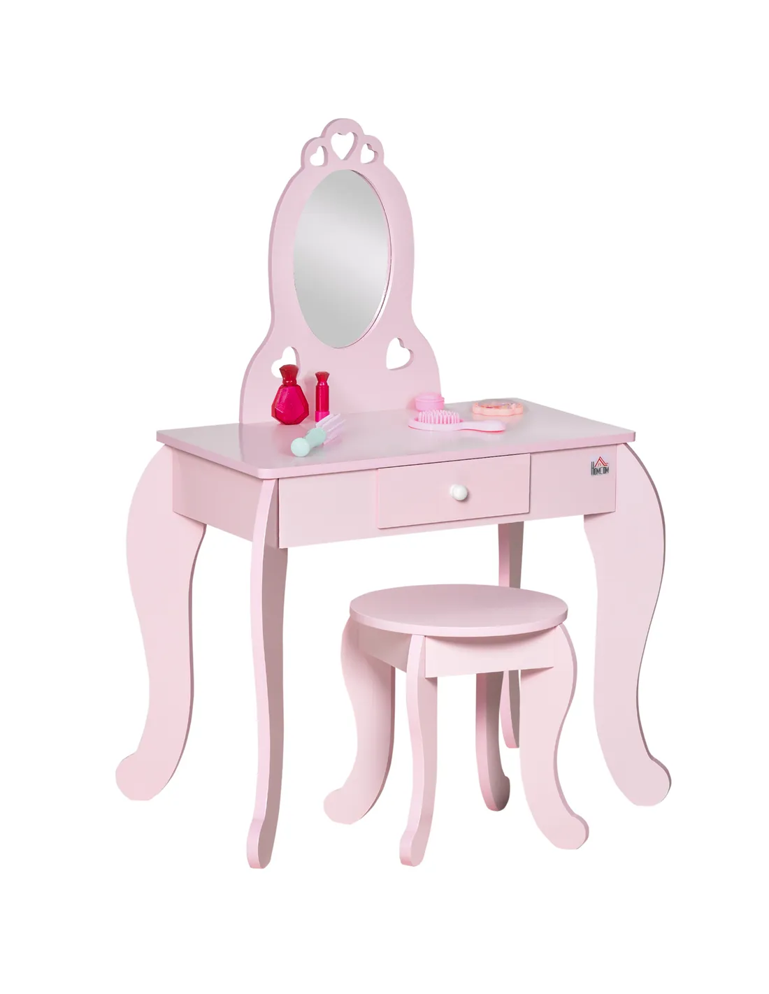 Princess perfect in a set. This dressing table and stool, from HOMCOM, is a noble way for them to get ready day and evening. Pink in colour, it features heart cut-outs on the top and side of the mirror for extra magic. The curved legs of the table and stool create a modern and relaxed look. There's a small drawer for keeping accessories safely stored. The mirror allows your child to get ready - whether just pretend getting ready, or going out to see friends.