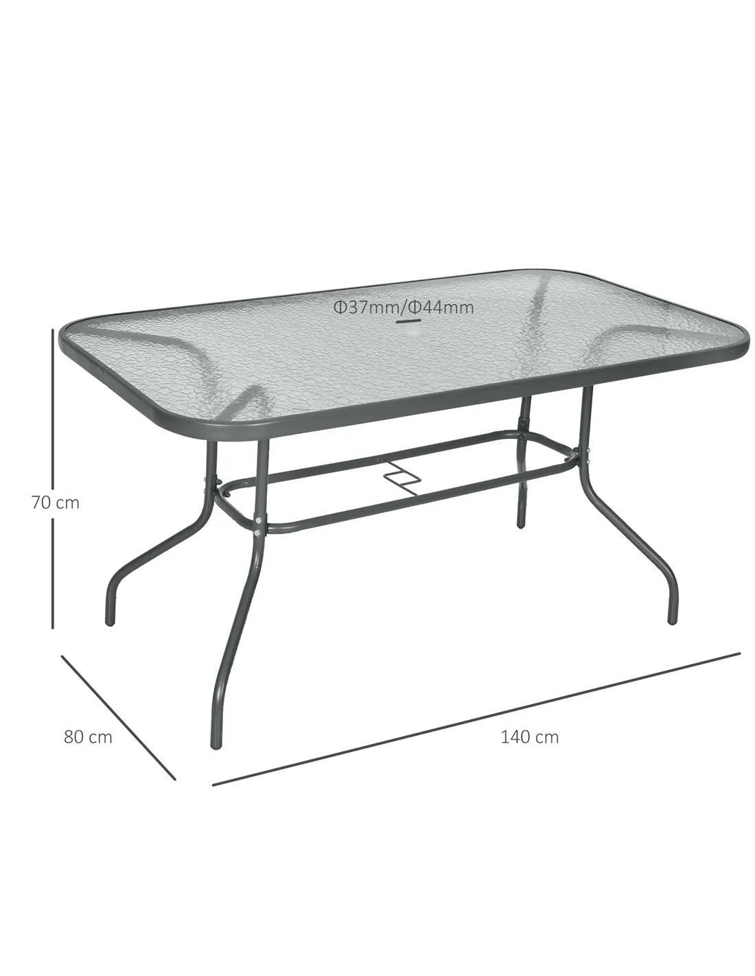 - Φ37mm / Φ44mm parasol hole in the middle of tabletop, keeps a sun umbrella upright and in place for shade and protection from direct sunlight
