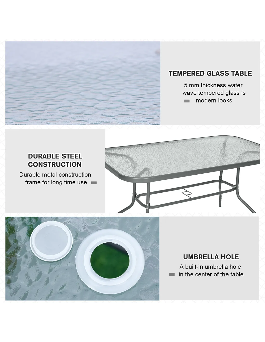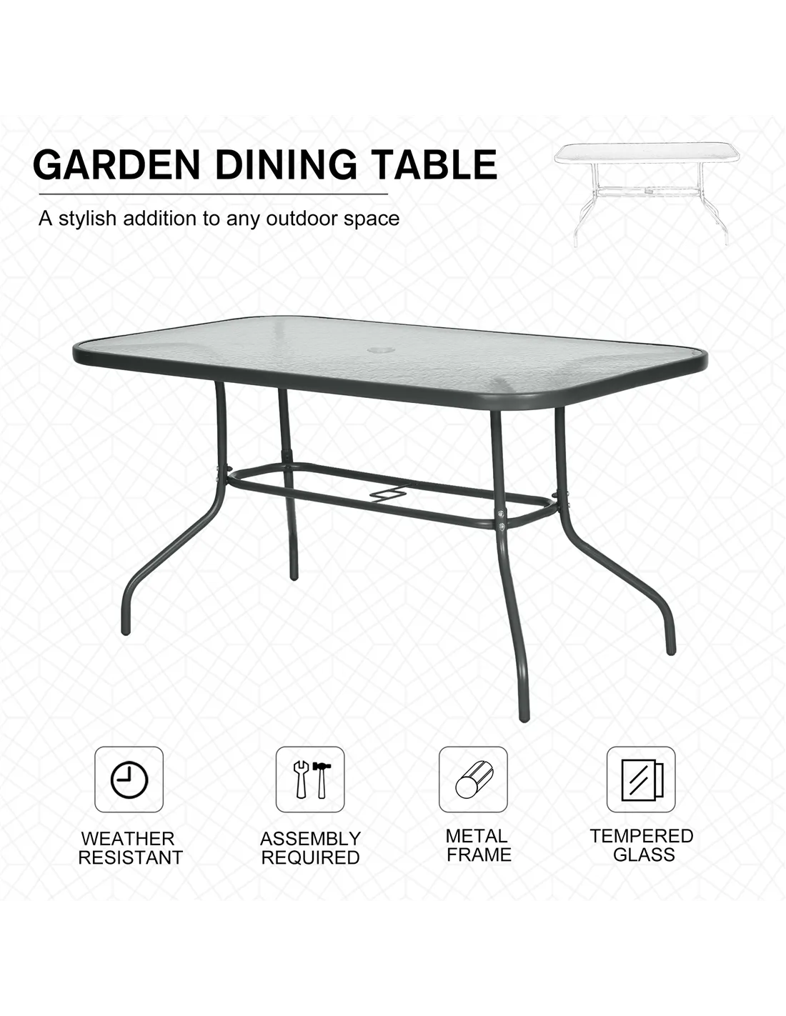 Effortlessly complement your outdoor set-up with this garden table with parasol hole from Outsunny. A versatile design, which blends itself in with a large variety of garden dining sets, it uses thick metal for the smoothly curved frame for a stable structure, with four evenly spaced legs to provide balance when in use. Aquatex glass covers the whole of the top, with a hole in the middle to place a sun umbrella for protective shade. A modern way to charm your guests when they visit.