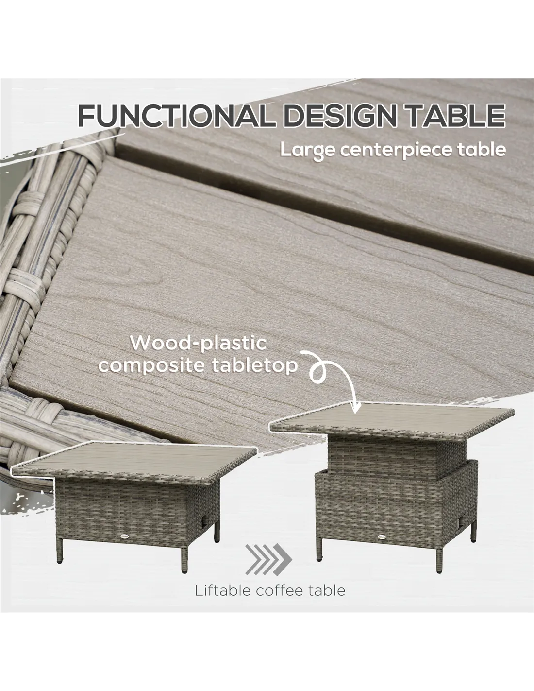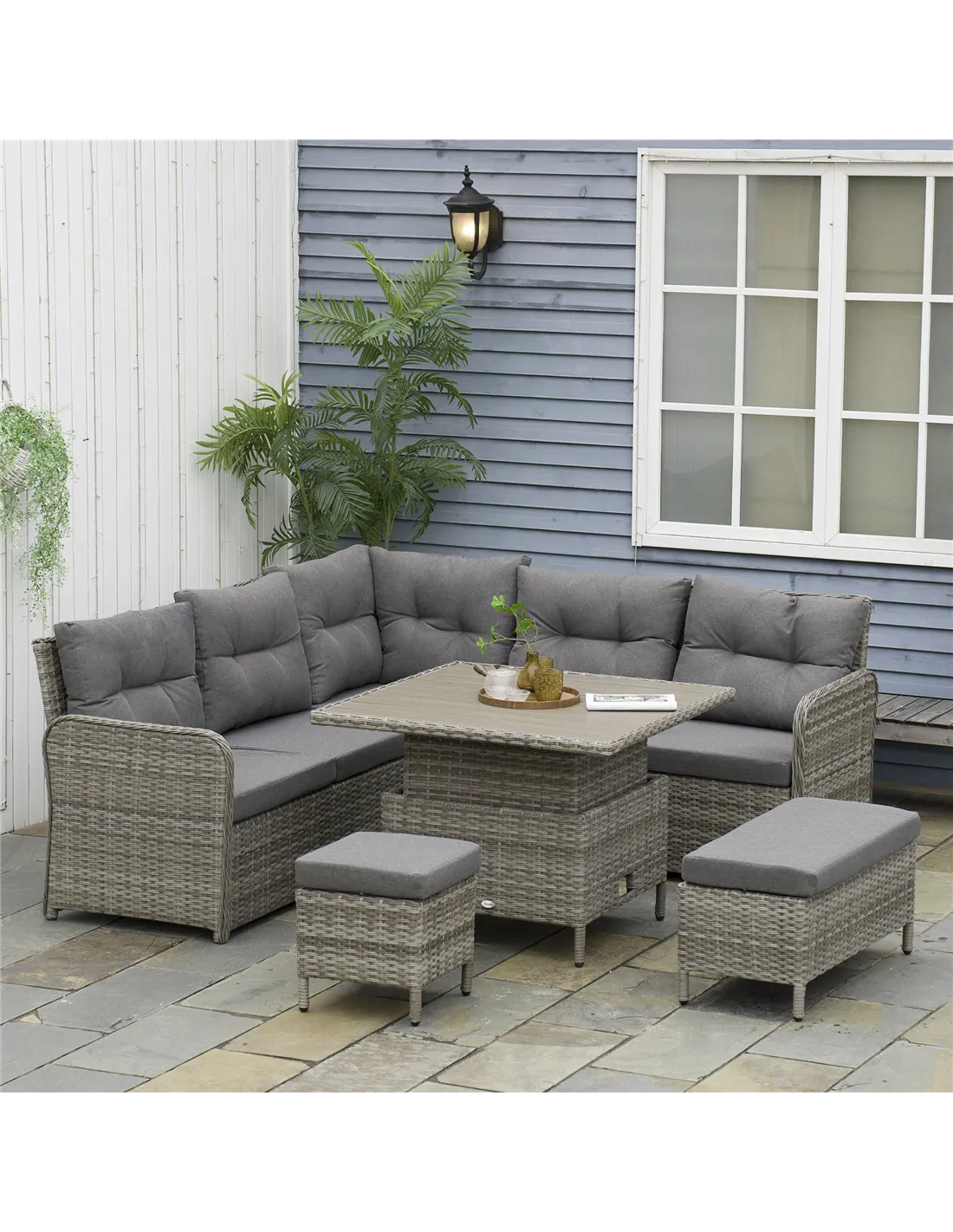 Relax together in comfort and style in this Outsunny rattan corner sofa set., Six pieces: corner chair, right-handed loveseat, left-handed loveseat, long footstool, square footstool and a liftable coffee table - arrange in a way you want. Metal frame for a strong core, wrapped in plastic rattan for support, durability and style. The table can be raised or lowered-dine at a level you want; comes with a wood-effect top for extra beauty.
