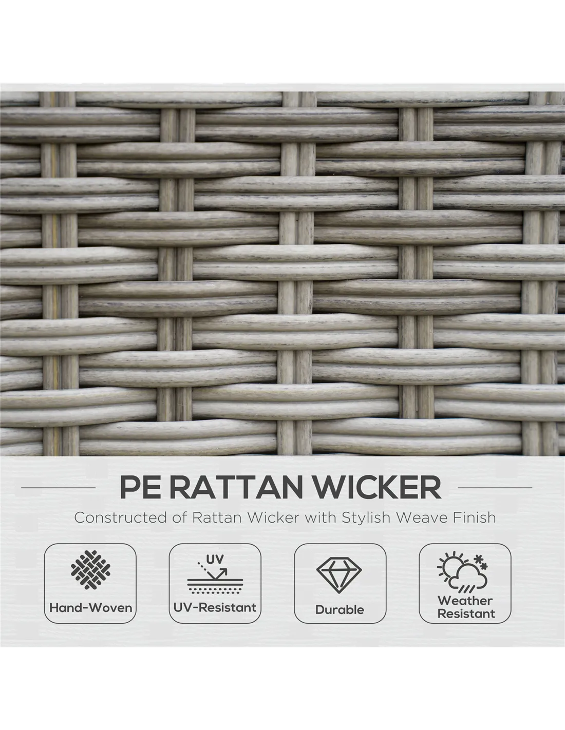 The set features a galvanised metal frame and weather-resistant PE rattan, designed to endure typical UK weather. However, it is recommended to use protective covers during harsh conditions to prolong its lifespan.