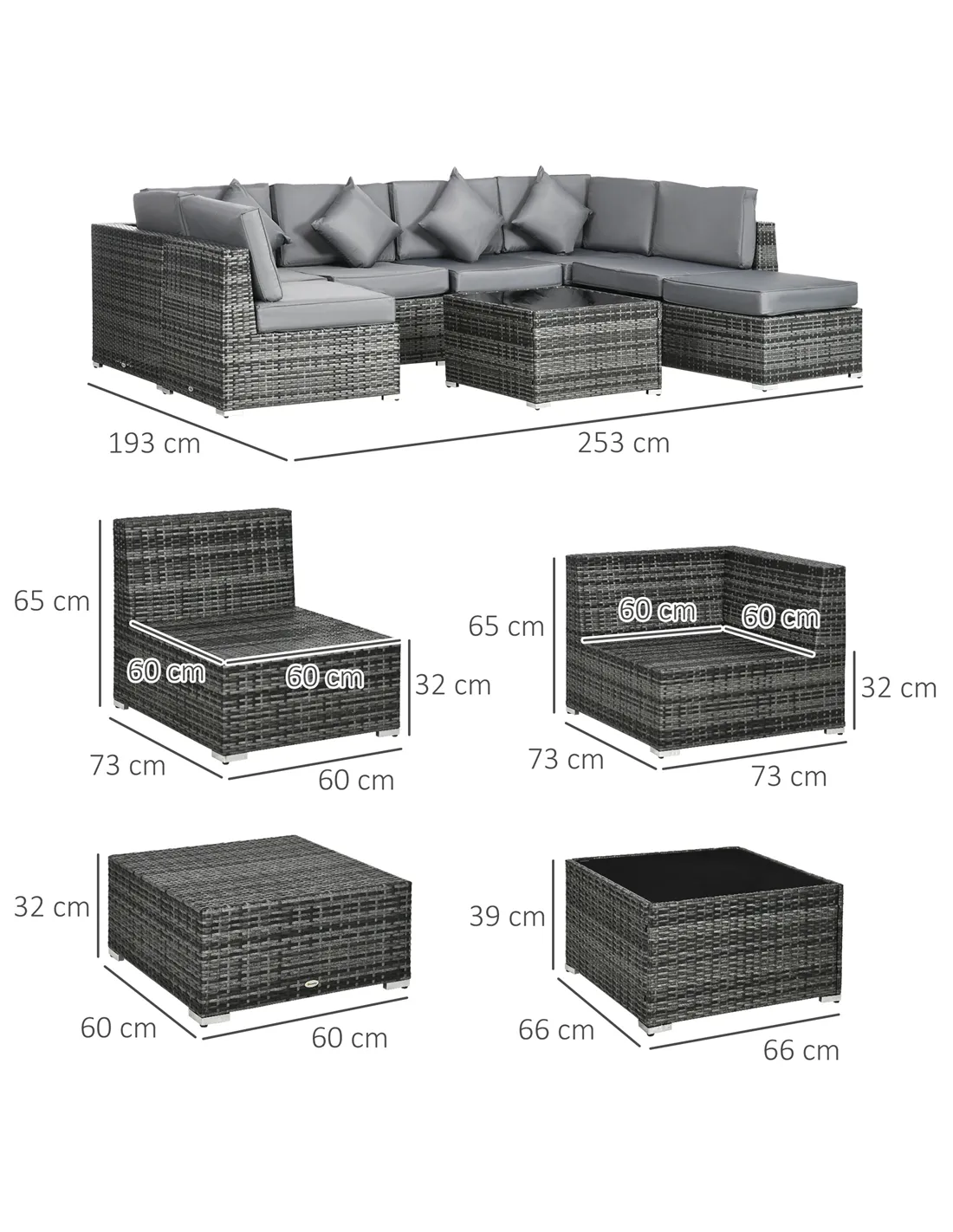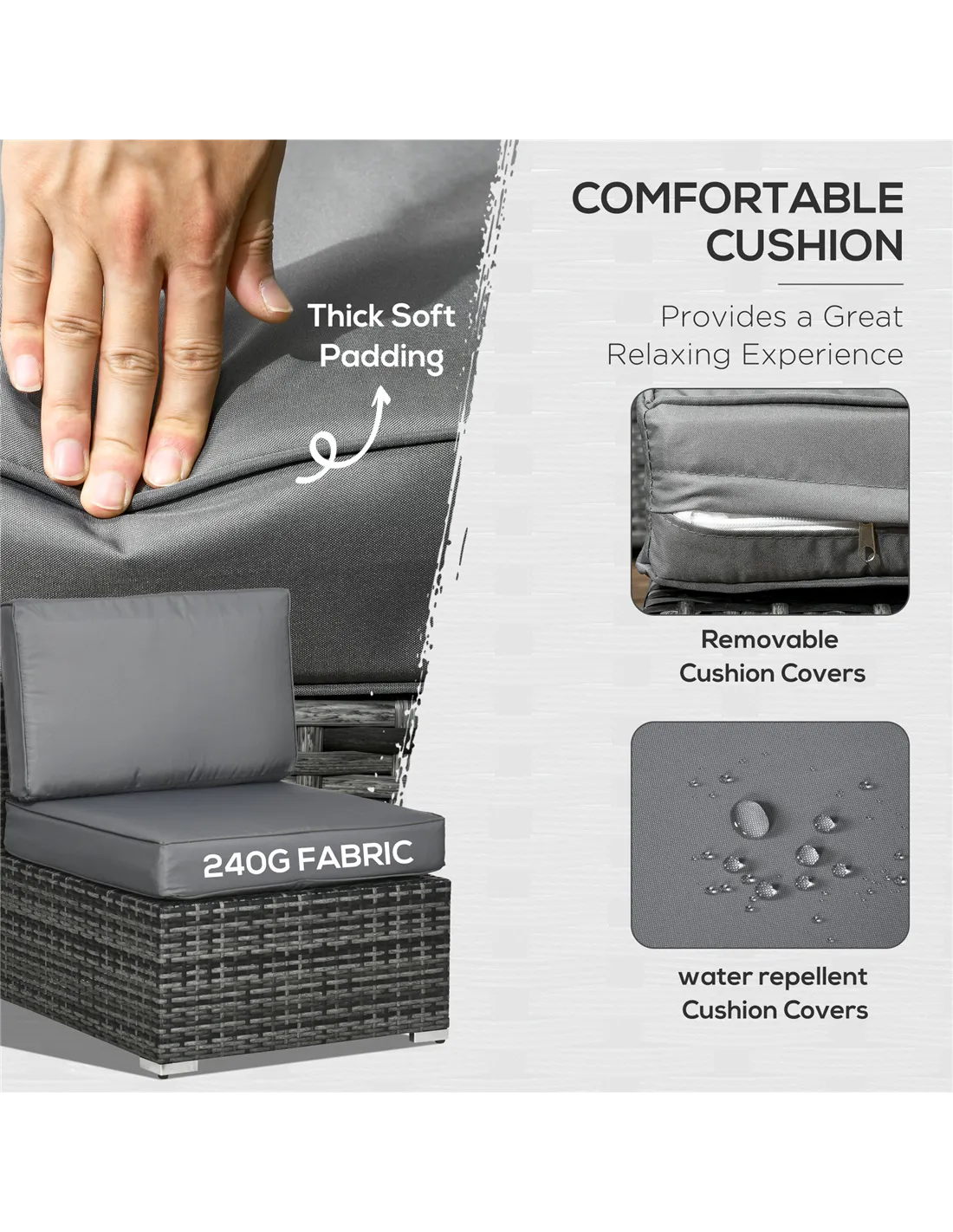 Make your garden stand out like never before. Say hello to this Outsunny garden corner sofa set. Each piece has a steel frame for strong support, wrapped in plastic wicker for double the durability; also creating a forever-stylish set for your outdoor space. Comes with two corner seats, four normal seats, a footstool and table - set up into a shape which you want. Padded cushions for comfort, with four coloured cushions for a touch of bold beauty.