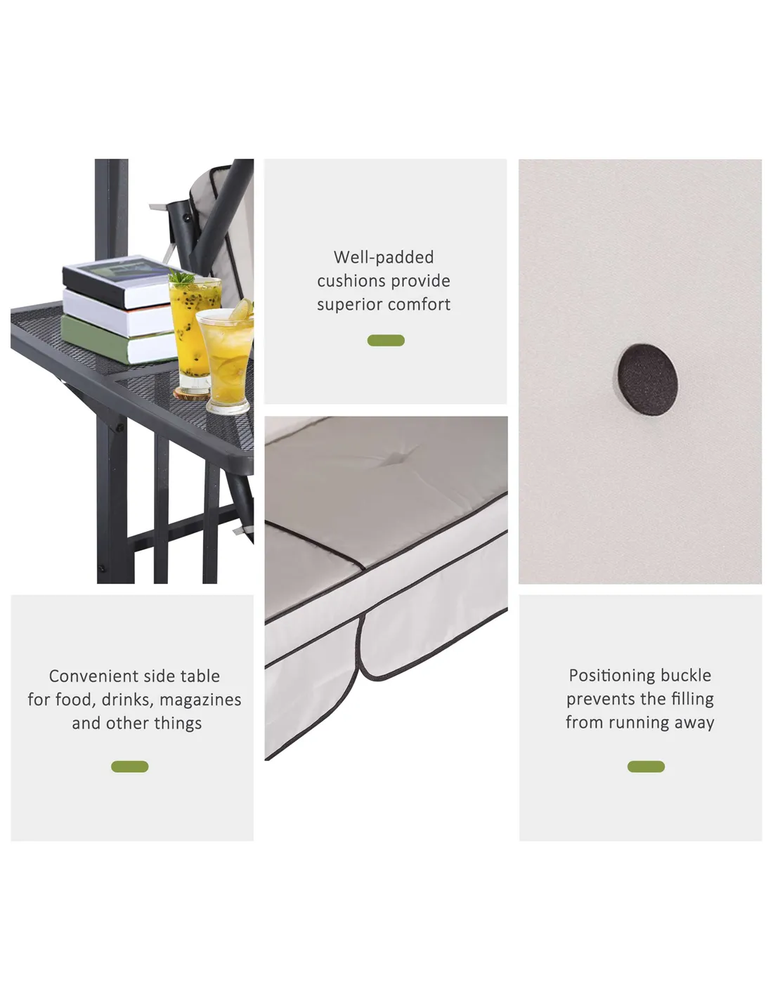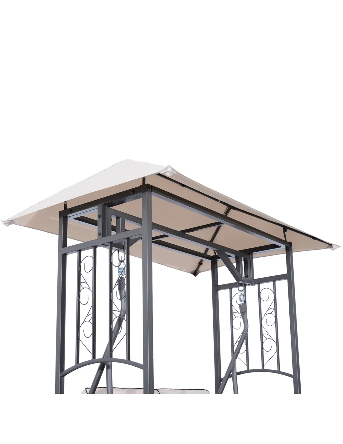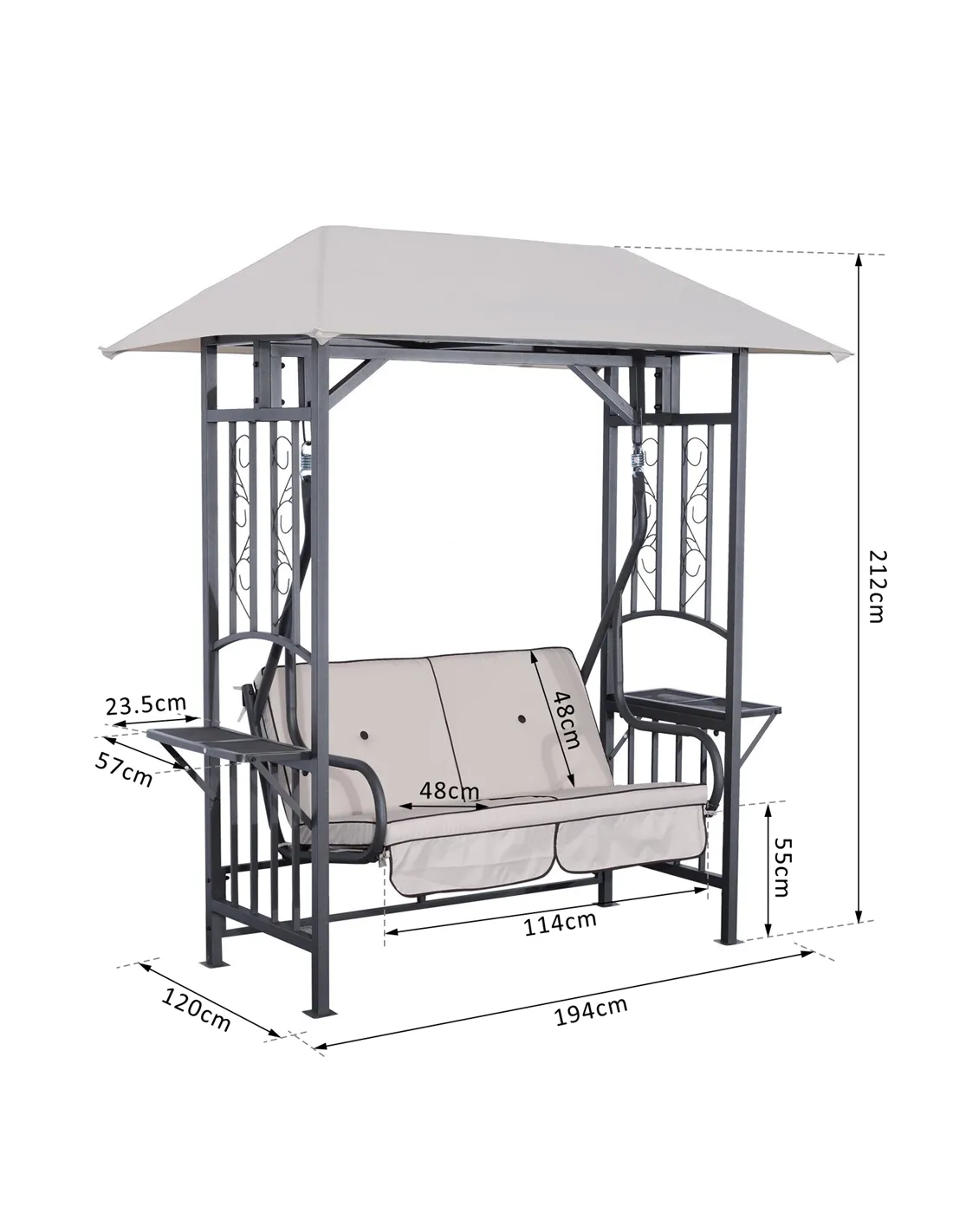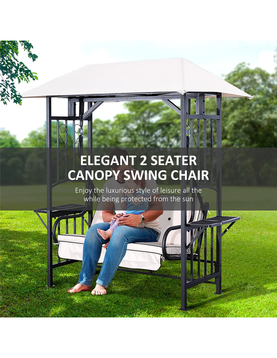 The Outsunny 2 seater canopy swing chair is perfect for enhancing your garden, patio, or porch with a touch of vintage charm and comfort. Ideal for relaxing afternoons, it offers a gentle swinging motion supported by a sturdy metal frame, making it a wonderful spot for reading, enjoying a cup of tea, or sharing a quiet moment with a loved one. The integrated side drink panels provide convenient space for beverages or small accessories, ensuring everything you need is within easy reach. Thanks to its weather-resistant materials and cushioned seating, this loveseat is equally suited for sheltered outdoor spaces or covered verandas, blending effortlessly with classic or contemporary outdoor décor.