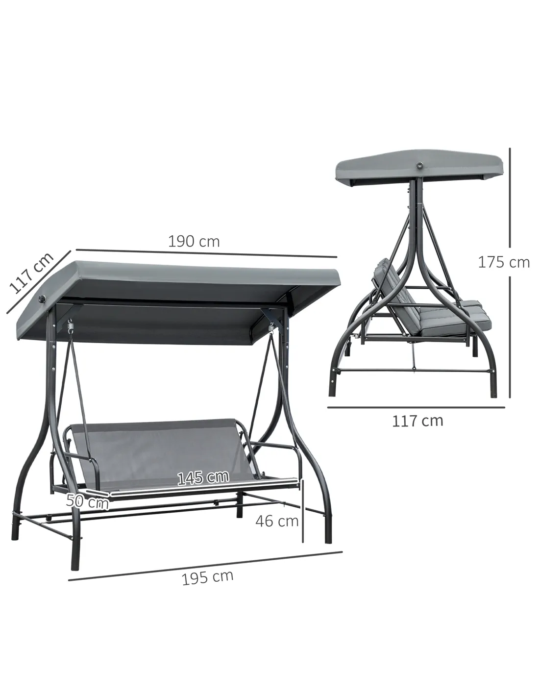 This Outsunny 3 seater garden swing is a welcome addition to any outdoor living space. It has a capacity to seat three people so you can enjoy with your friends. The adjustable canopy will keep you covered from sunlight and light rain. The swinging chair seat and back cushion is padded for comfort - the back can be folded flat to transform this into a bed.