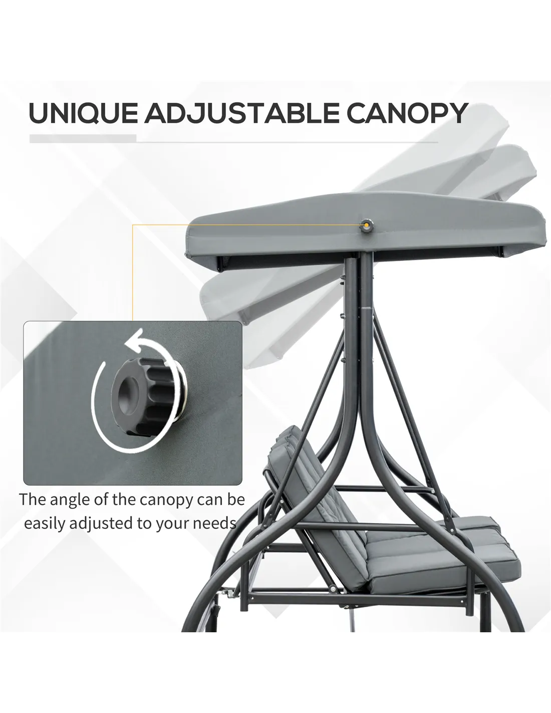 The swing supports up to 240kg, comfortably seating three adults at once. - Can the canopy be adjusted to block the sun at different angles?