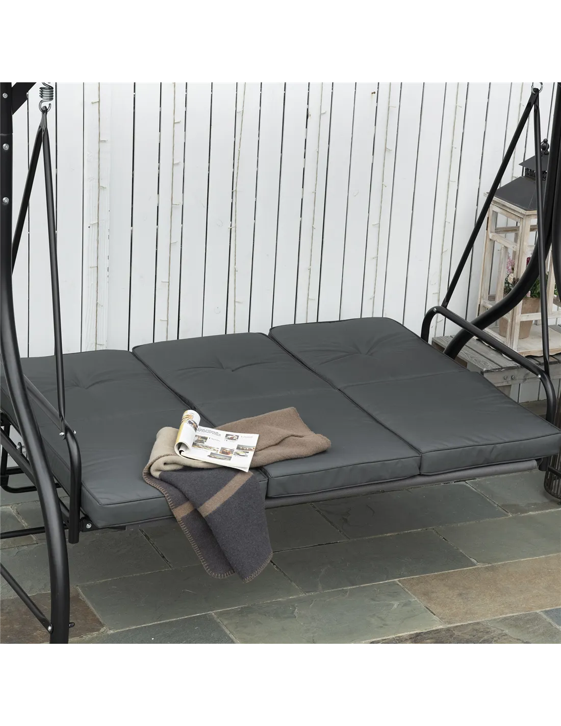 - Transform the swing into a cosy outdoor bed by folding the backrest flat, creating a peaceful spot for sunbathing or an afternoon nap under the adjustable canopy.