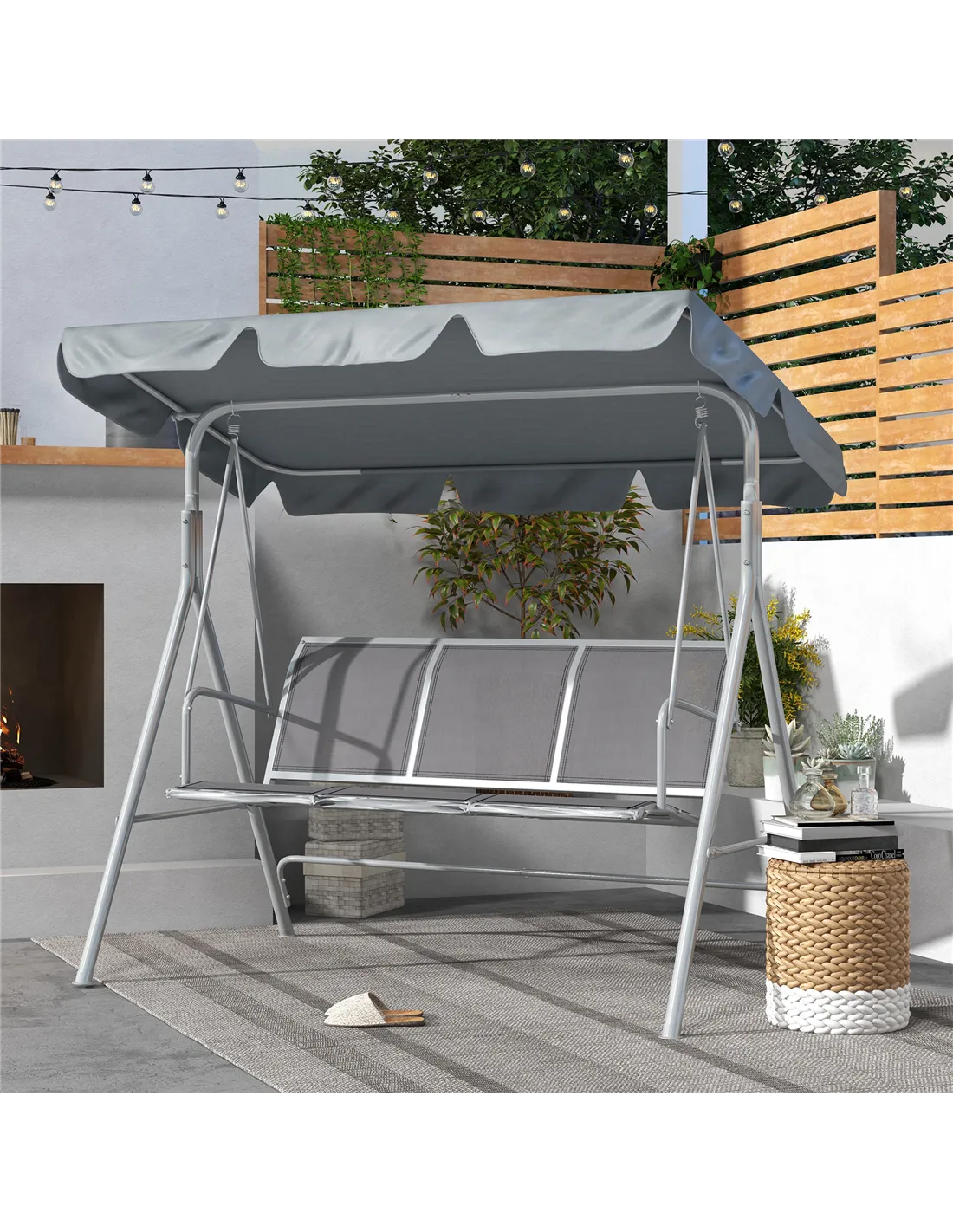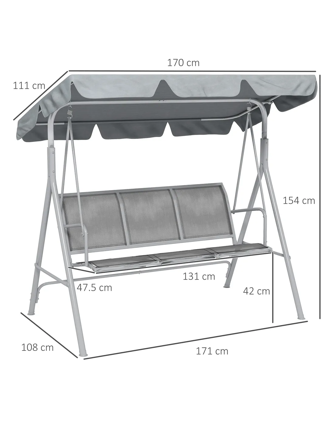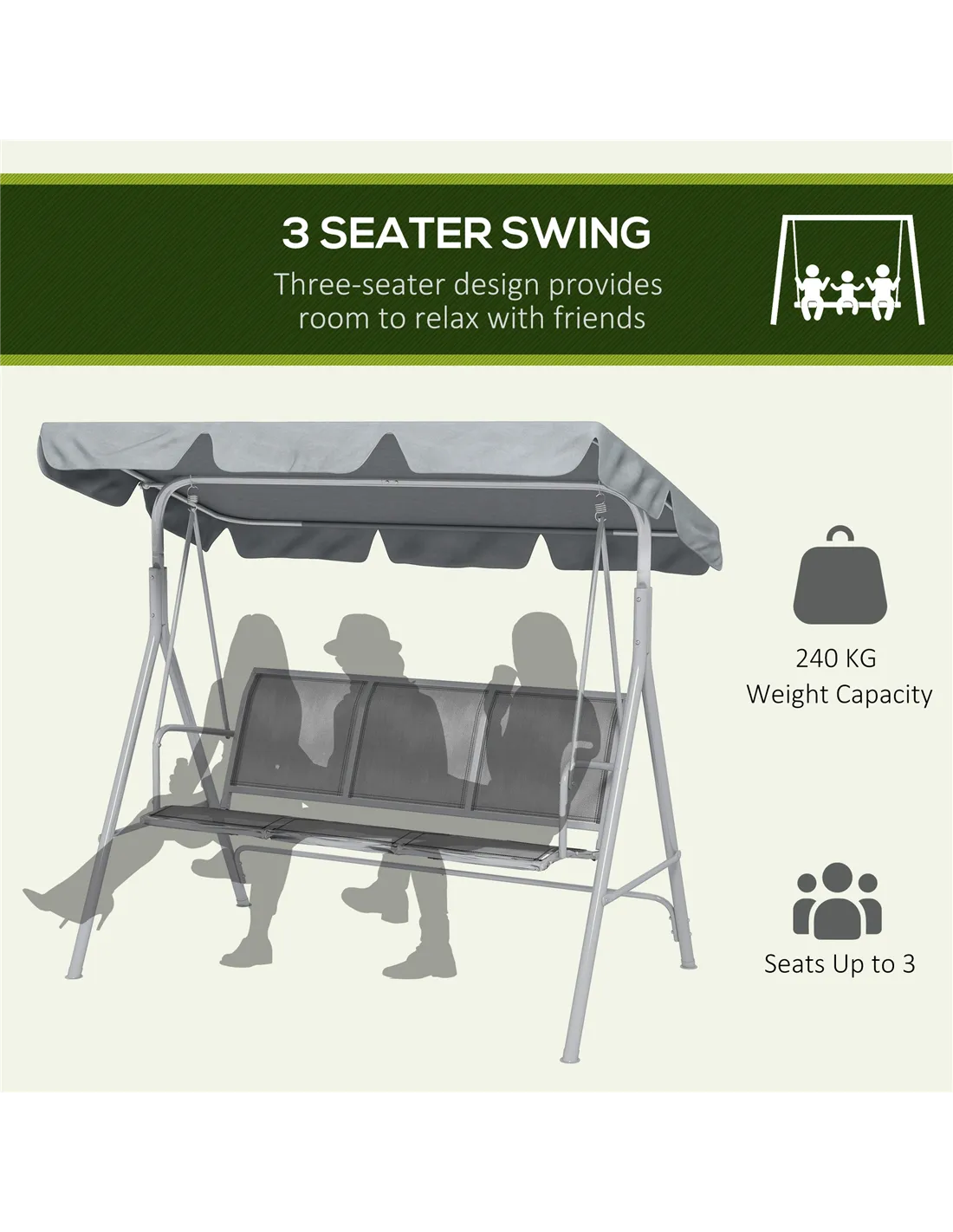 The Outsunny 3-seater garden swing chair is a versatile addition to any outdoor setting. Ideal for relaxing afternoons on your patio or garden, it comfortably seats three adults, making it perfect for family gatherings or socialising with friends. The light grey canopy provides excellent protection from sun and light rain, allowing you to enjoy fresh air without worrying about the weather. Use it as a cosy hammock bench for reading, sipping tea, or simply unwinding after a long day. Its modern design complements various garden styles, from contemporary to classic, enhancing your outdoor living space with both comfort and style.