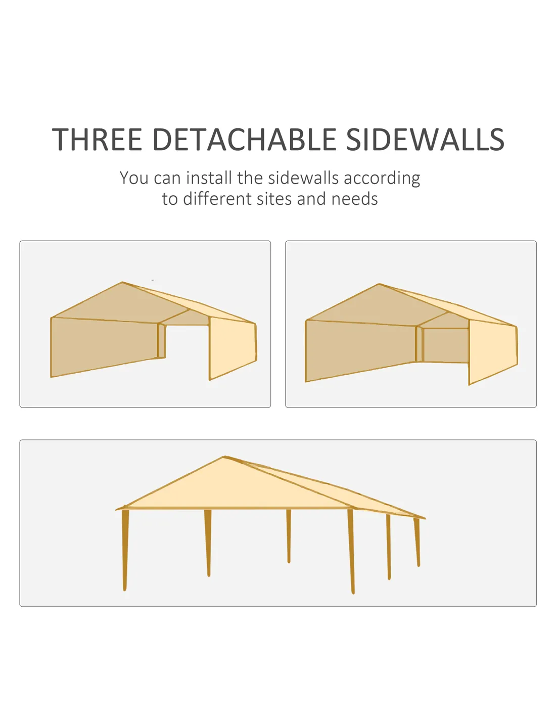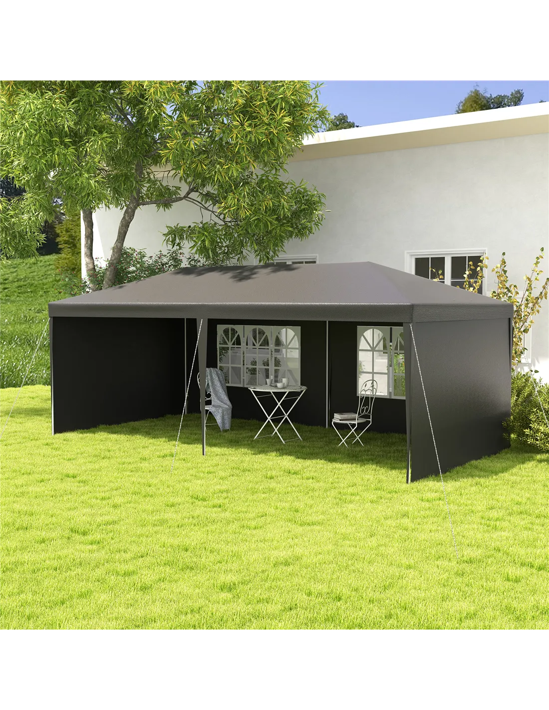 Create safe shelter with guests when entertaining outdoors - do it with this Outsunny 5.83 x 2.95m marquee gazebo with sides. It's formed of a steel frame for a tough structure, with a durable plastic canopy covering half - no front for an open feeling. Six guy ropes and 12 ground pegs are included to pin to the ground for extra stability. For many events like BBQS, family parties, wedding receptions, BBQs and more. Finished with handy adjustable feet.