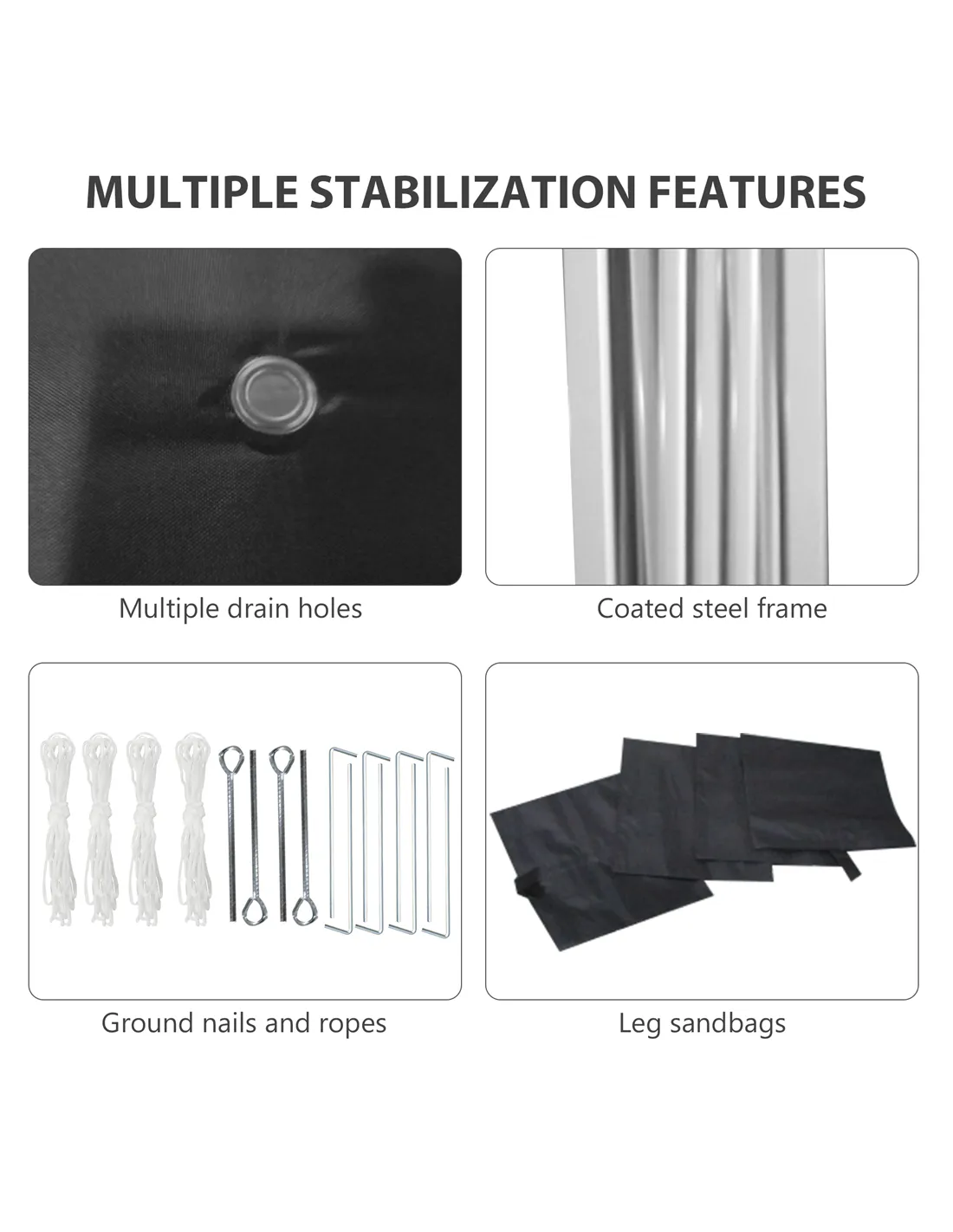 - Guy ropes, ground pegs and sandbags included for extra support and weight
