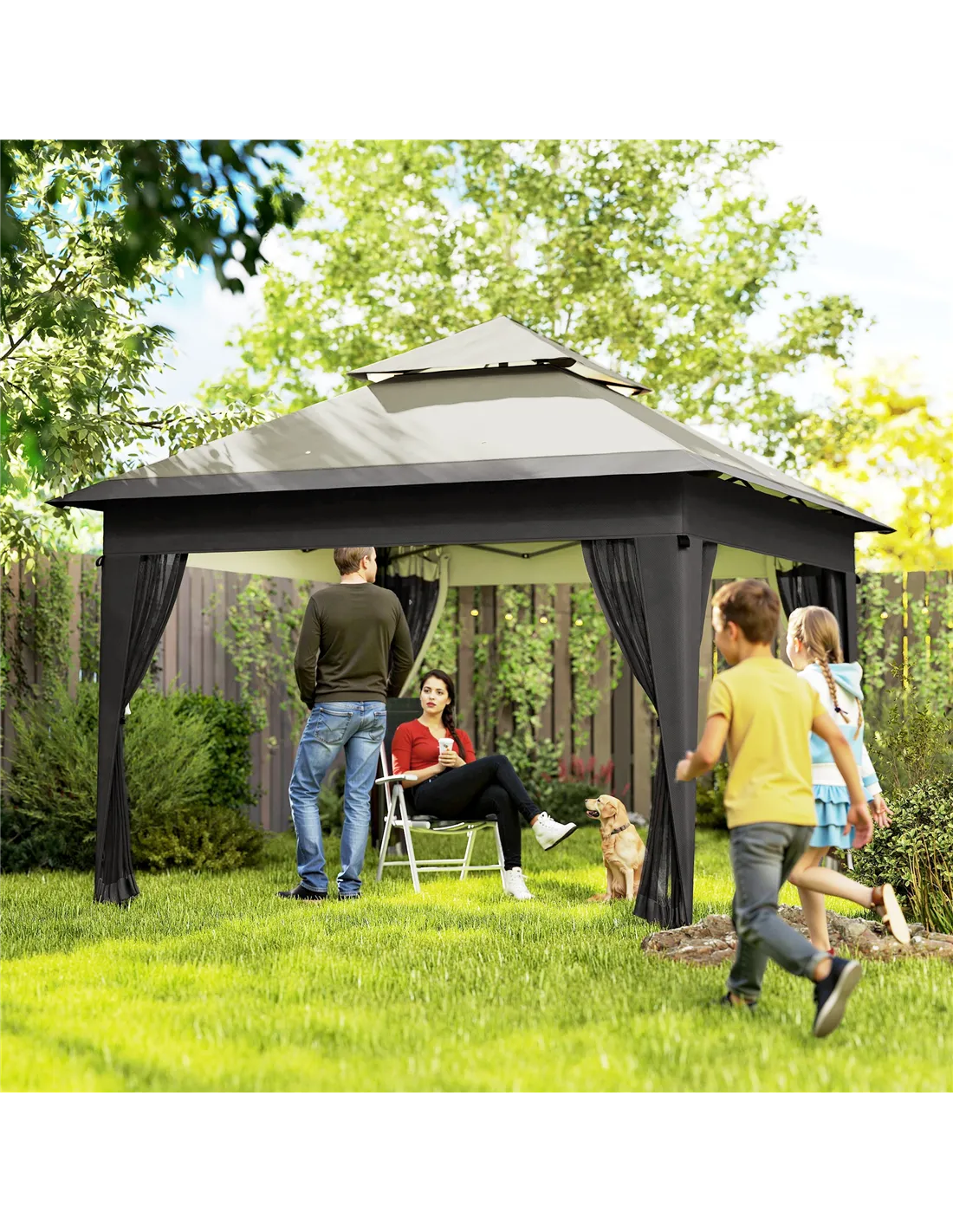 Yes, the gazebo features an easy pop-up design with a central button for quick setup and takedown, requiring minimal effort and no tools. - Can the height be adjusted to suit different needs?