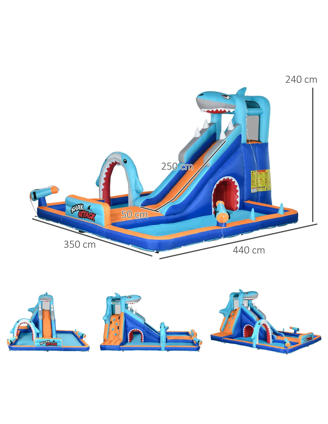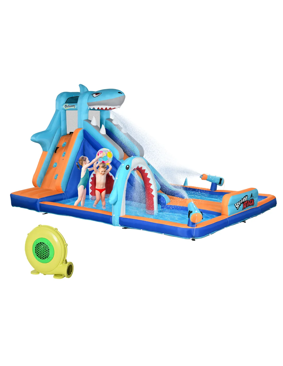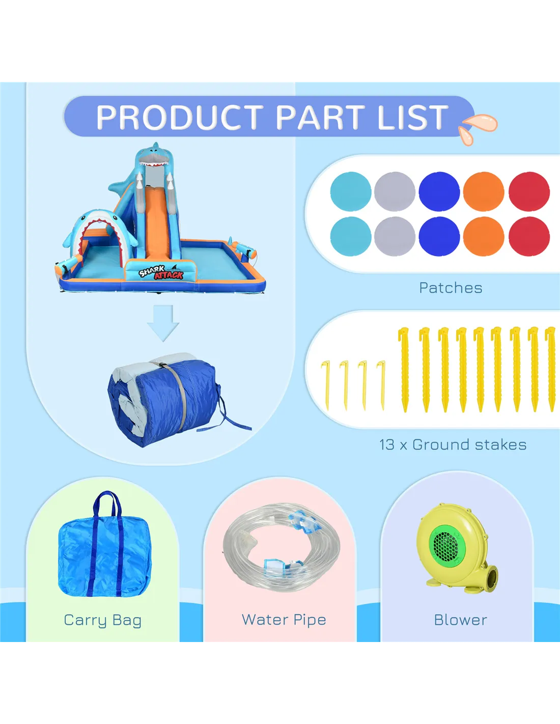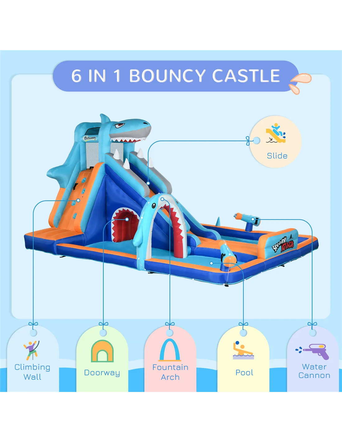 Outsunny 6 in 1 Shark-Themed Bouncy Castle, Inflatable Water Park, with Slide, Pool, Trampoline, Blower, for Ages 3-8 Years