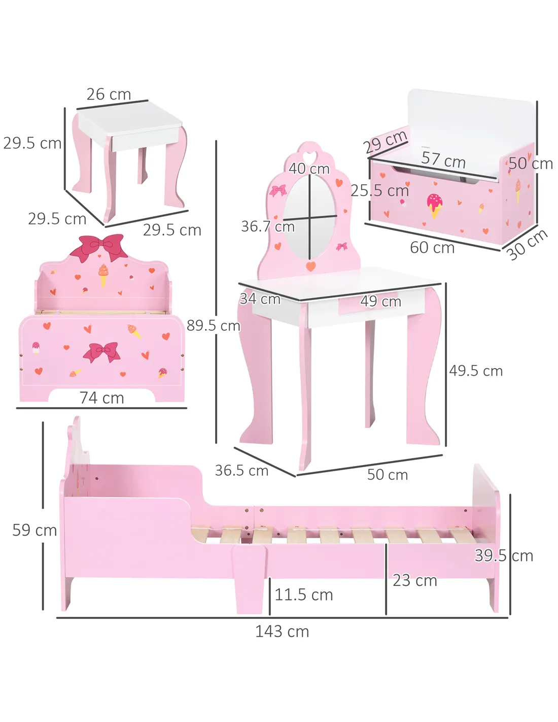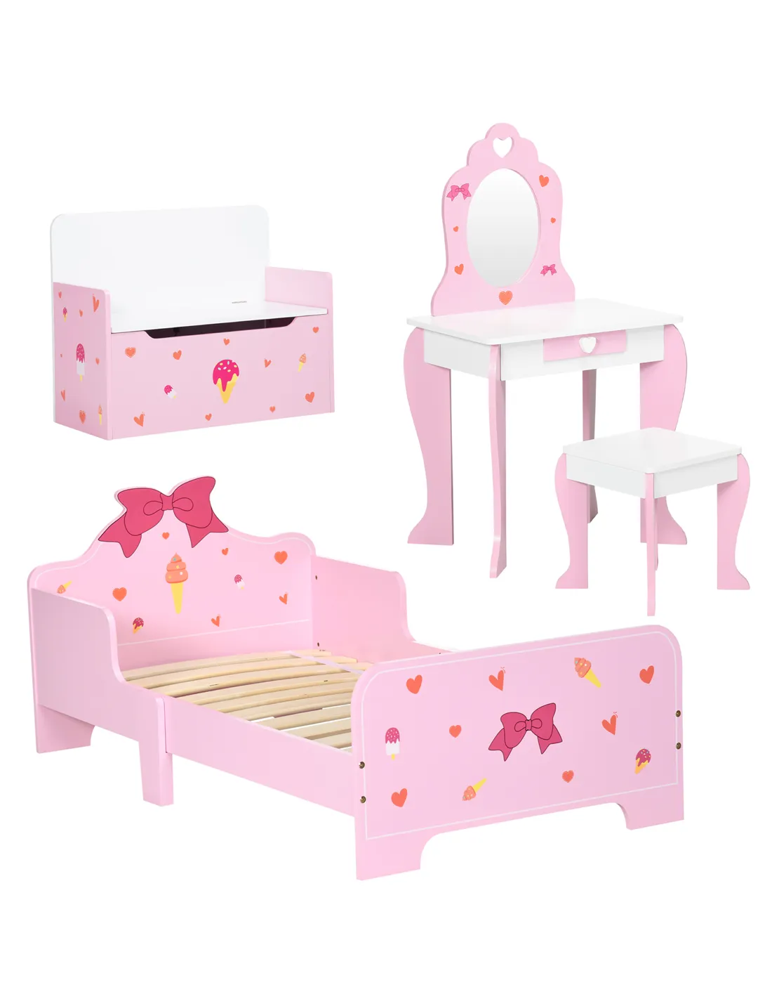 - Four-piece set includes a dressing table, matching stool, bed and toy box bench