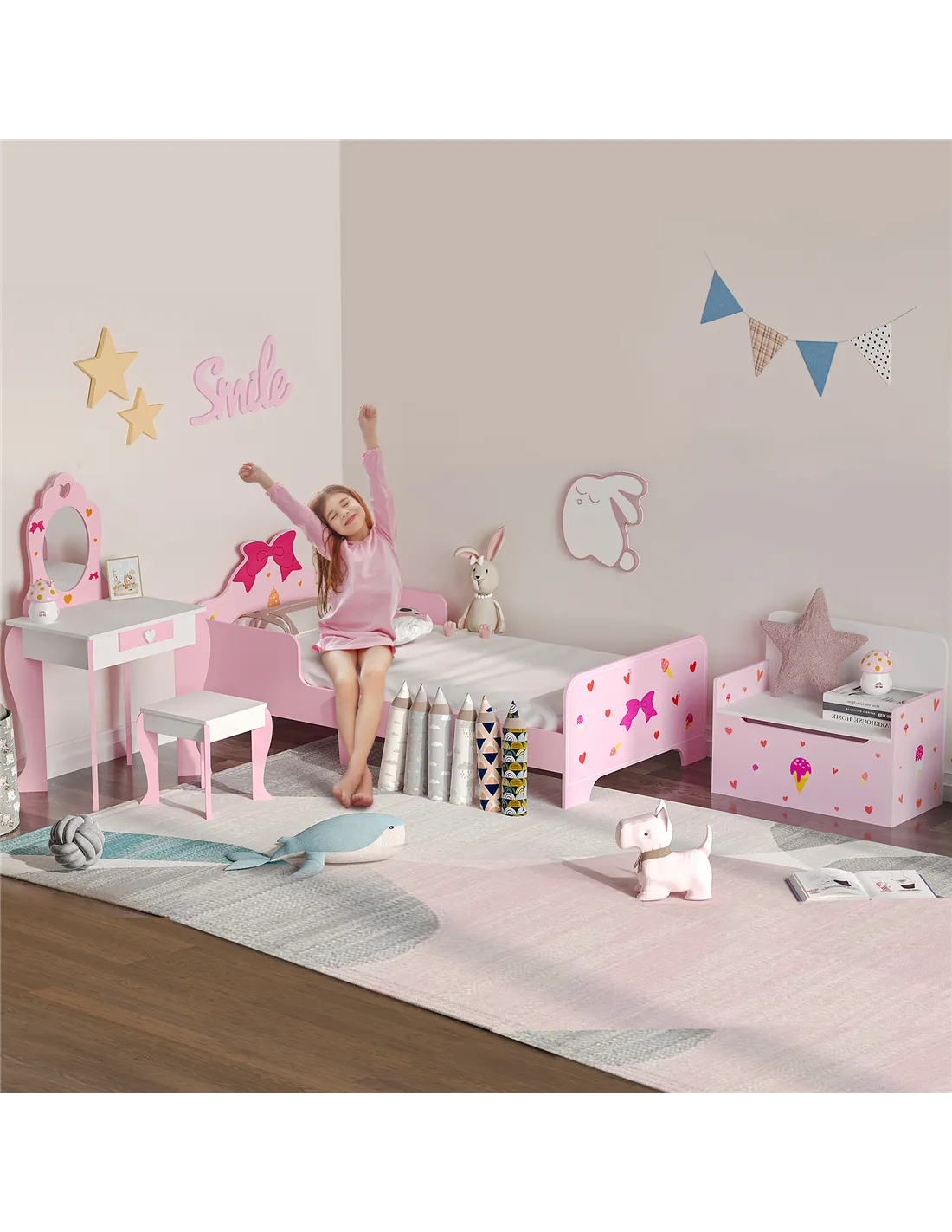 The ZONEKIZ 4-piece children’s bedroom set is designed to create a charming and practical space for young ones aged 3 to 6 years. Ideal for a princess-themed bedroom, this pink furniture collection includes a bed, toy box bench, dressing table, and stool, perfectly sized for little users. Use the toy box bench not only for storing toys, books, and clothes but also as a comfortable seating area during playtime or story sessions. The dressing table with its clear acrylic mirror encourages imaginative play and helps develop fine motor skills. This set fits beautifully in bedrooms, playrooms, or even nursery settings, offering a cohesive and delightful environment that supports both rest and creativity.