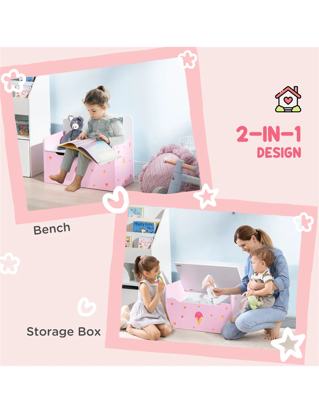 - The toy chest can be used for storage and a place to sit