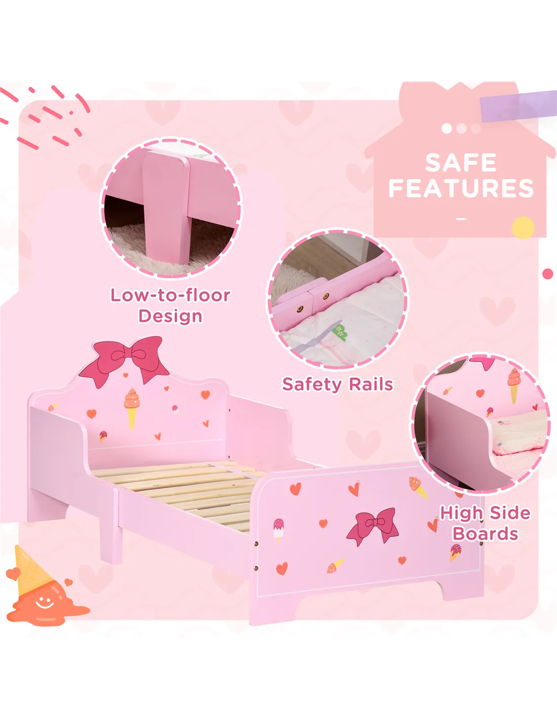 Absolutely. The set is made from durable MDF with smooth, rounded edges to prevent injuries, and it complies with EN71-1-2-3, EN716, and EN71-3 safety standards. - What mattress size fits the bed?