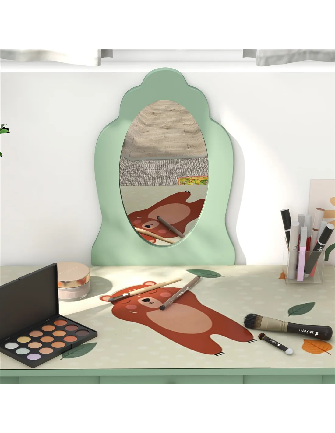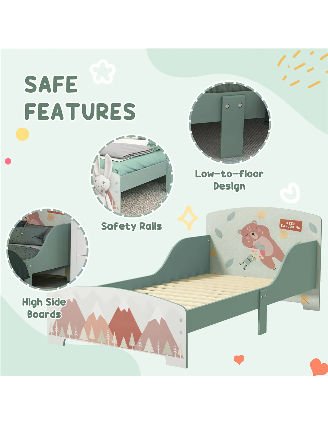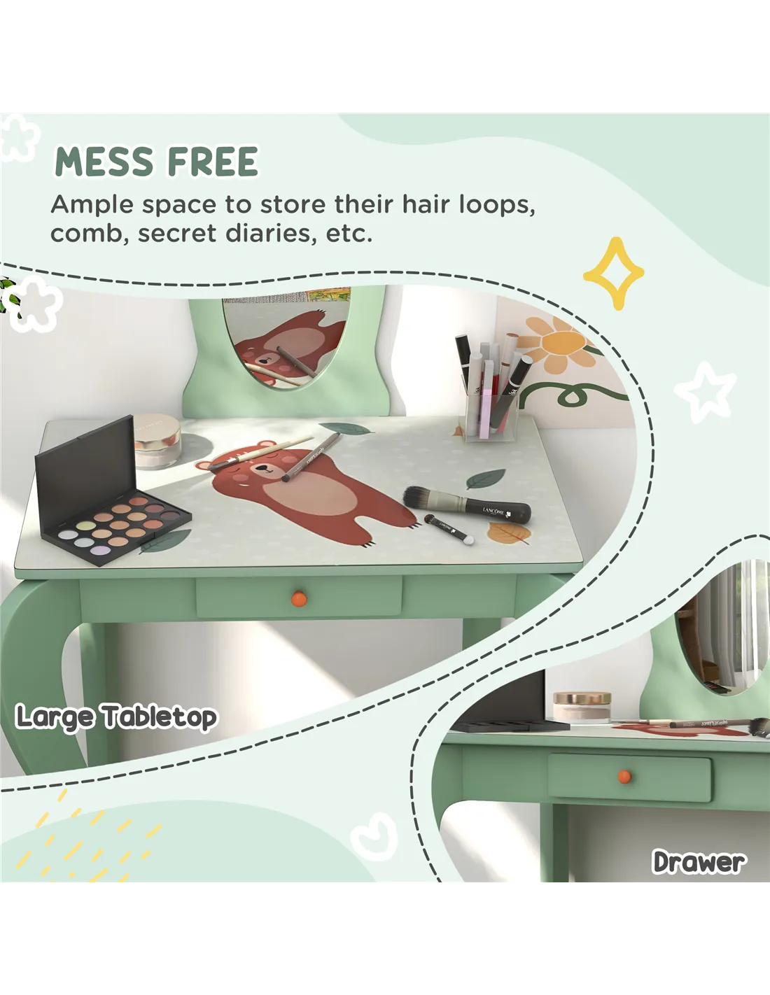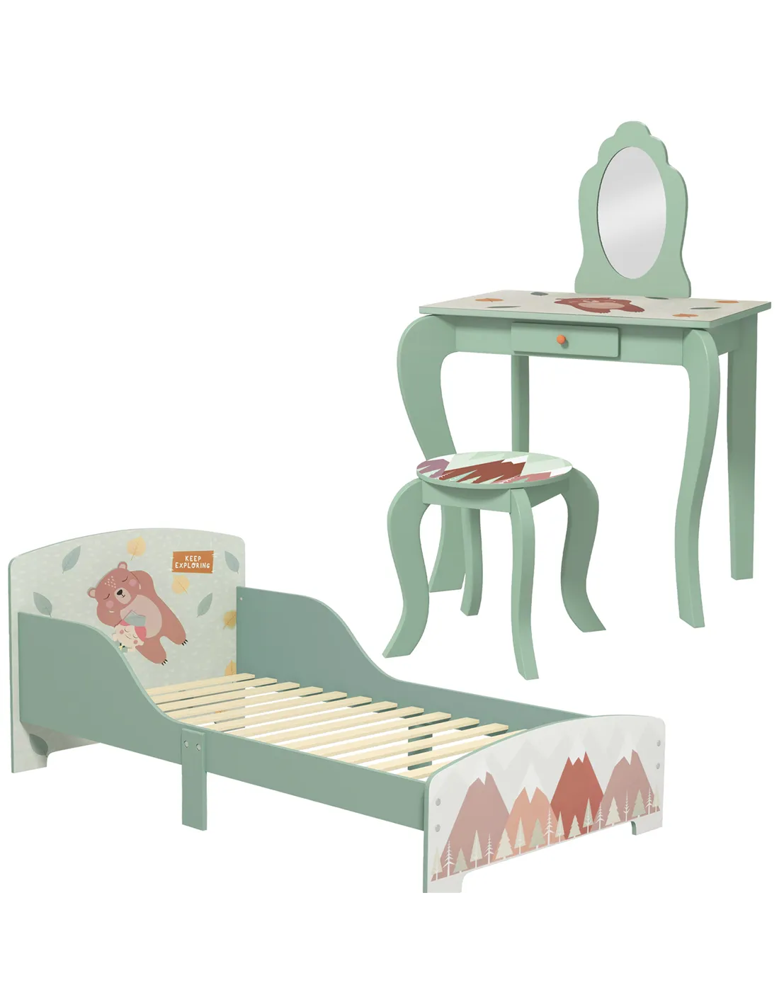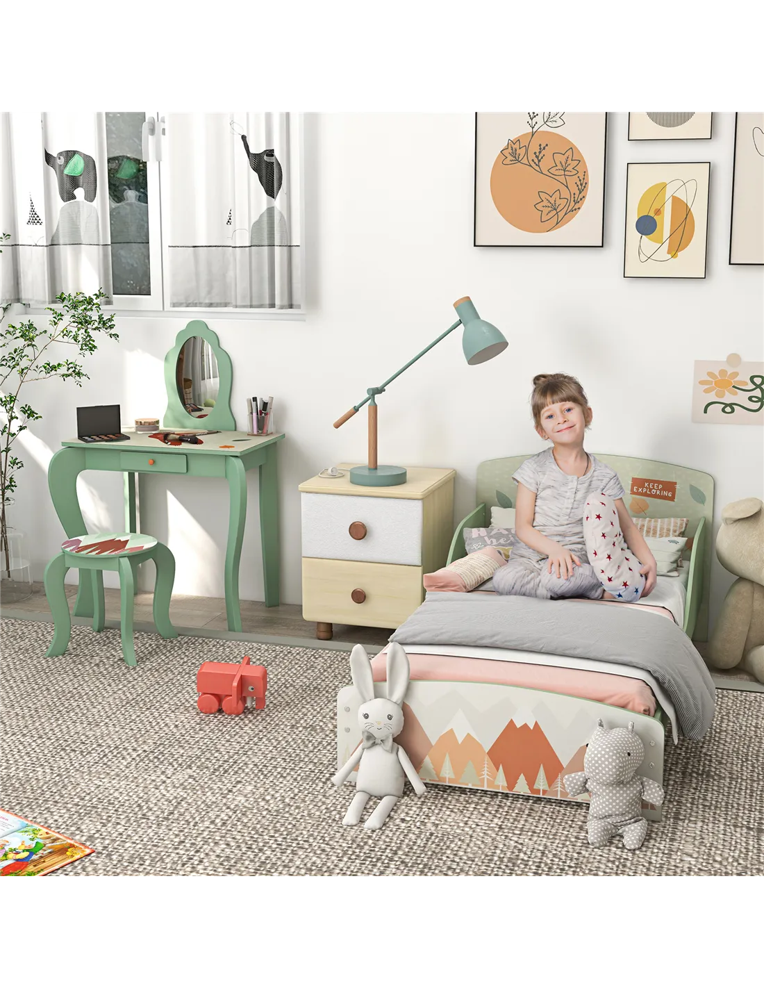 ZONEKIZ Toddler Bed Frame, Kids Dressing Table with Mirror and Stool, Cute Animal Design Kids Bedroom Furniture Set for Ages 3-6 Years, Green