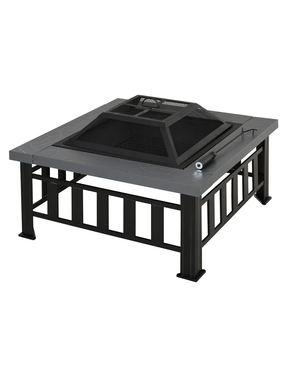- Attached poker tool that can be used for stoking fire and removing the mesh lid
