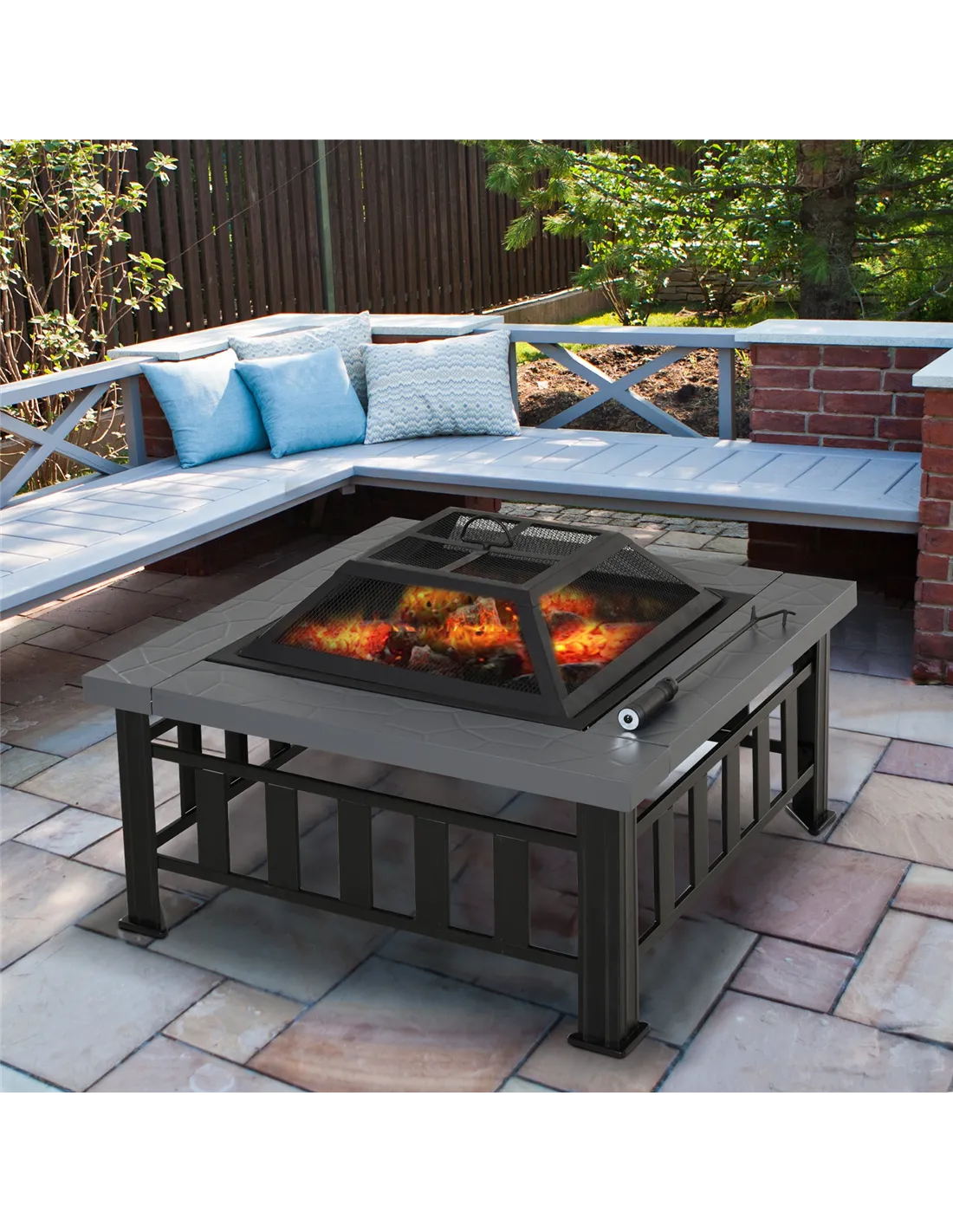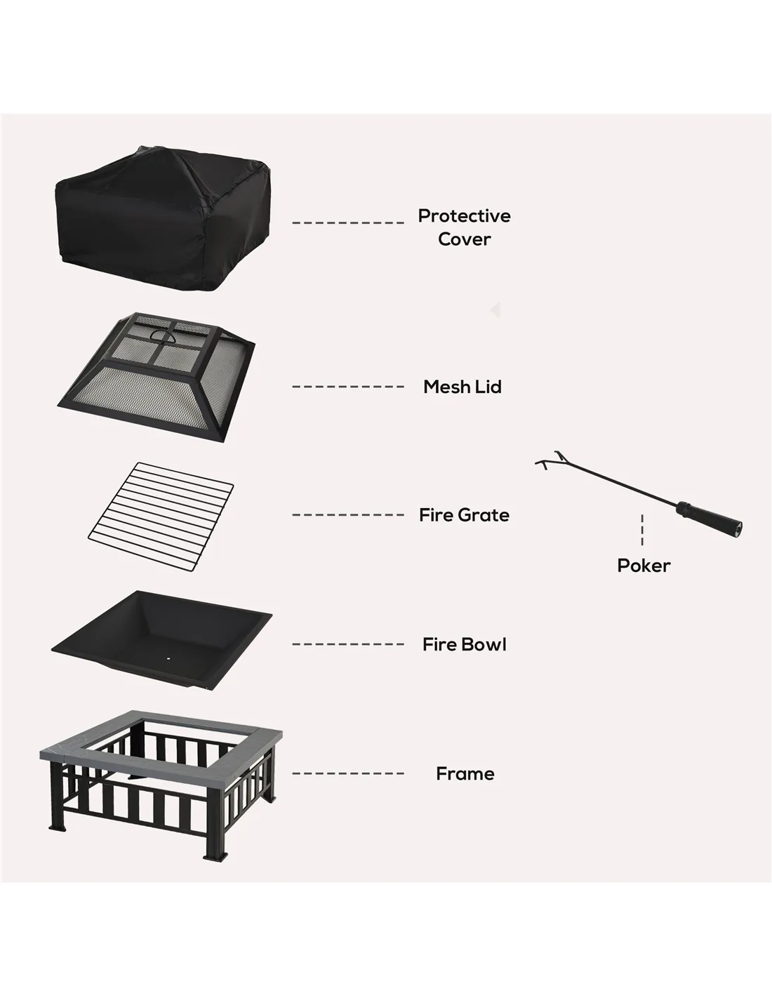 - Safety and waterproof mesh cover encloses the fire for safety as well as preventing debris or sparks flying