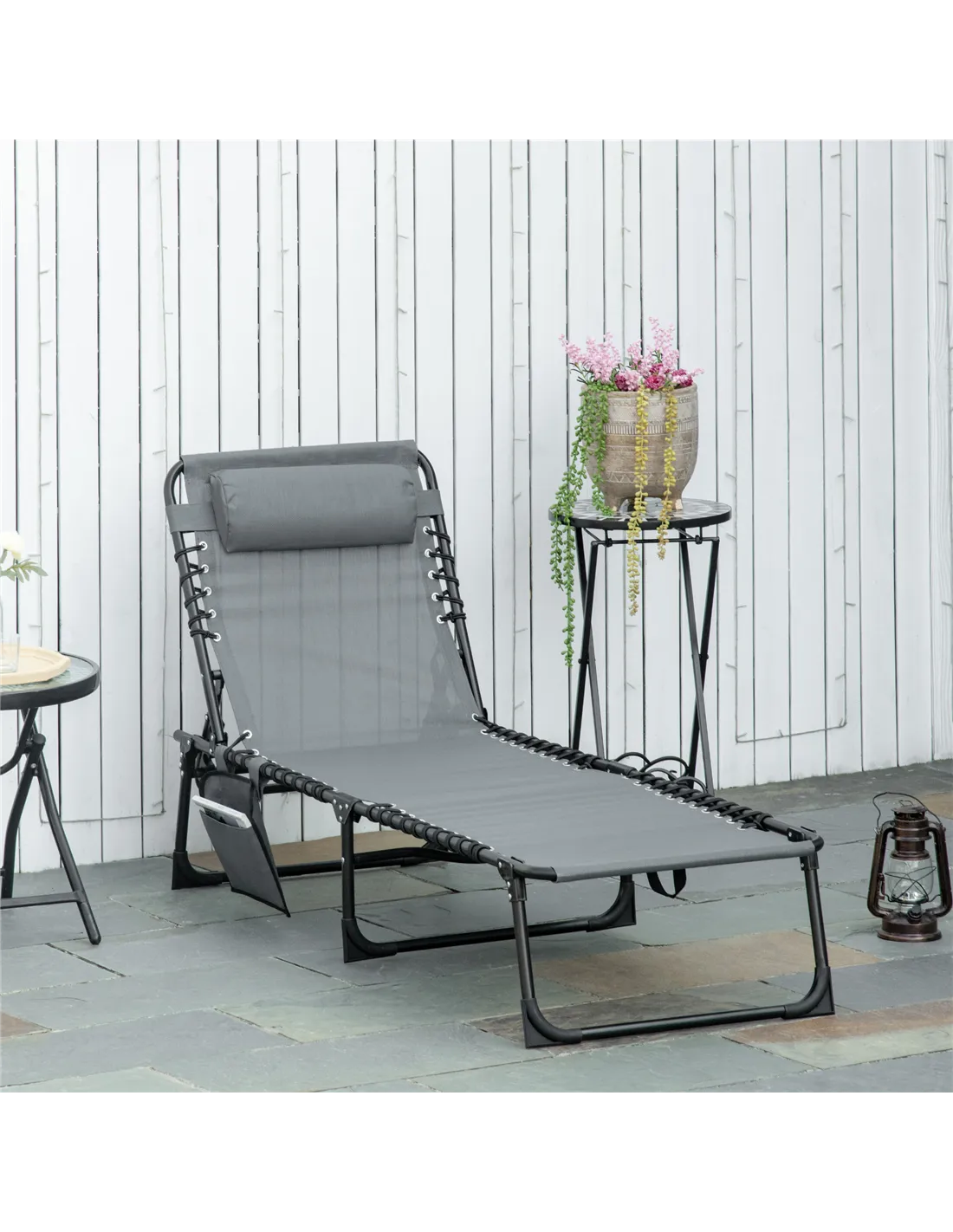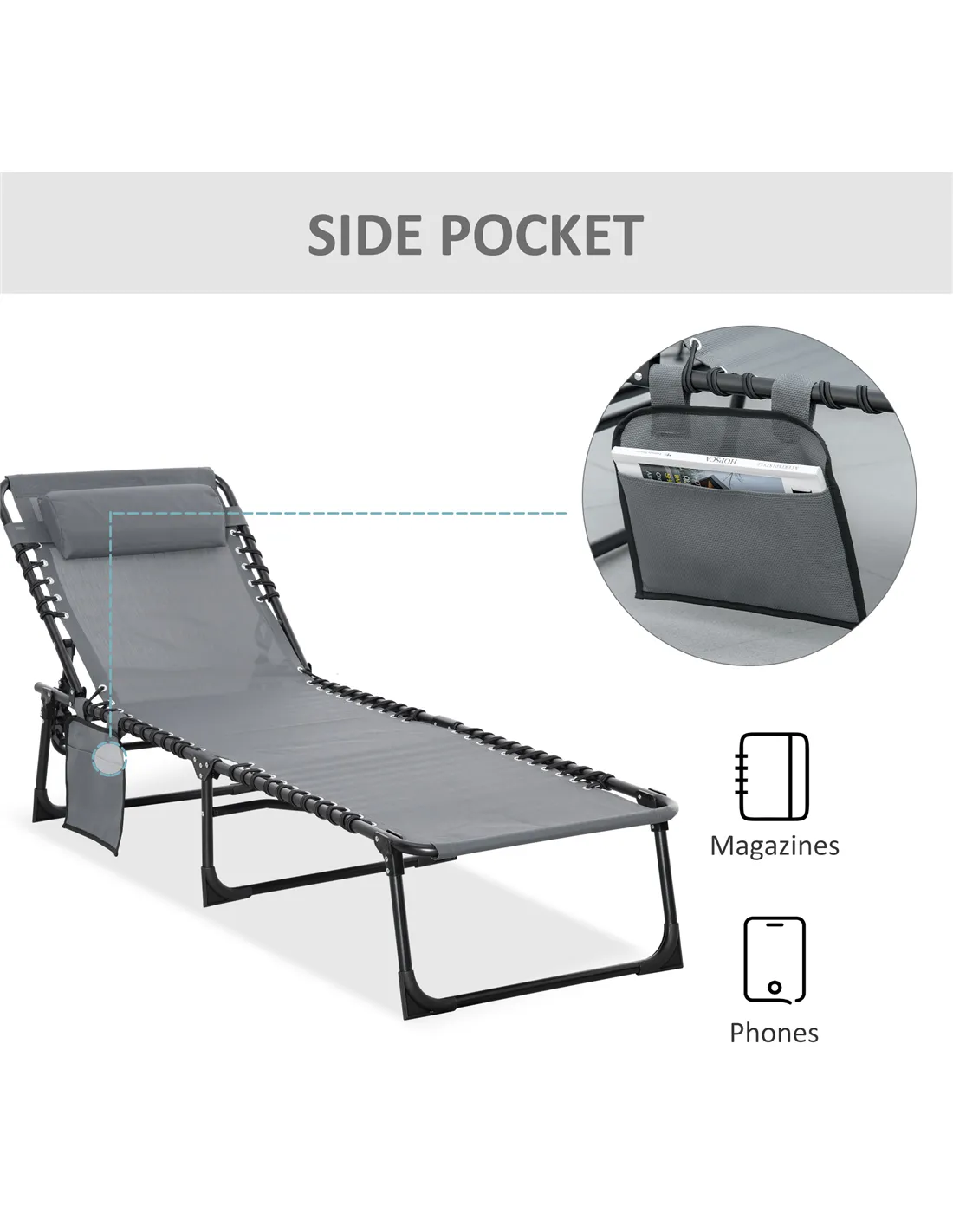 Outsunny Portable Sun Lounger, Folding Camping Bed Cot, Reclining Lounge Chair 5-position Adjustable Backrest with Side Pocket, Pillow for Patio Garden Beach Pool, Grey