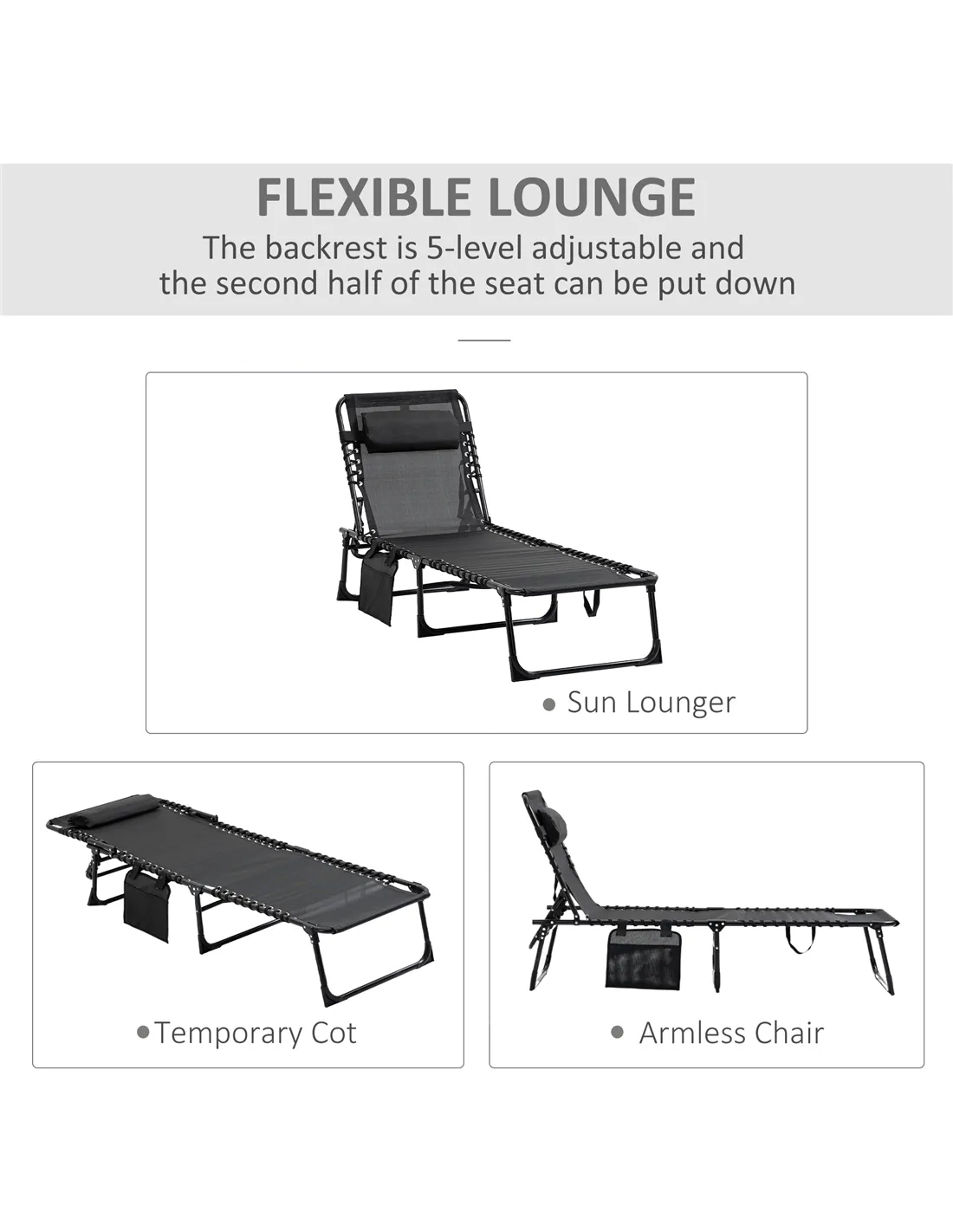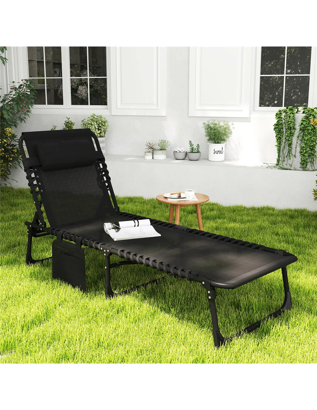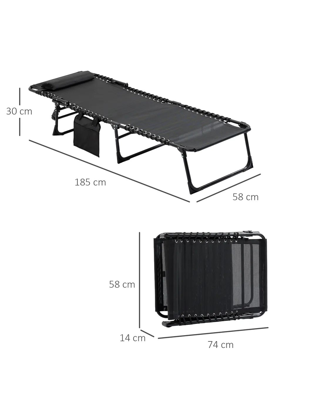 Outsunny Portable Sun Lounger, Folding Camping Bed Cot, Reclining Lounge Chair 5-position Adjustable Backrest with Side Pocket, Pillow for Patio Garden Beach Pool, Black