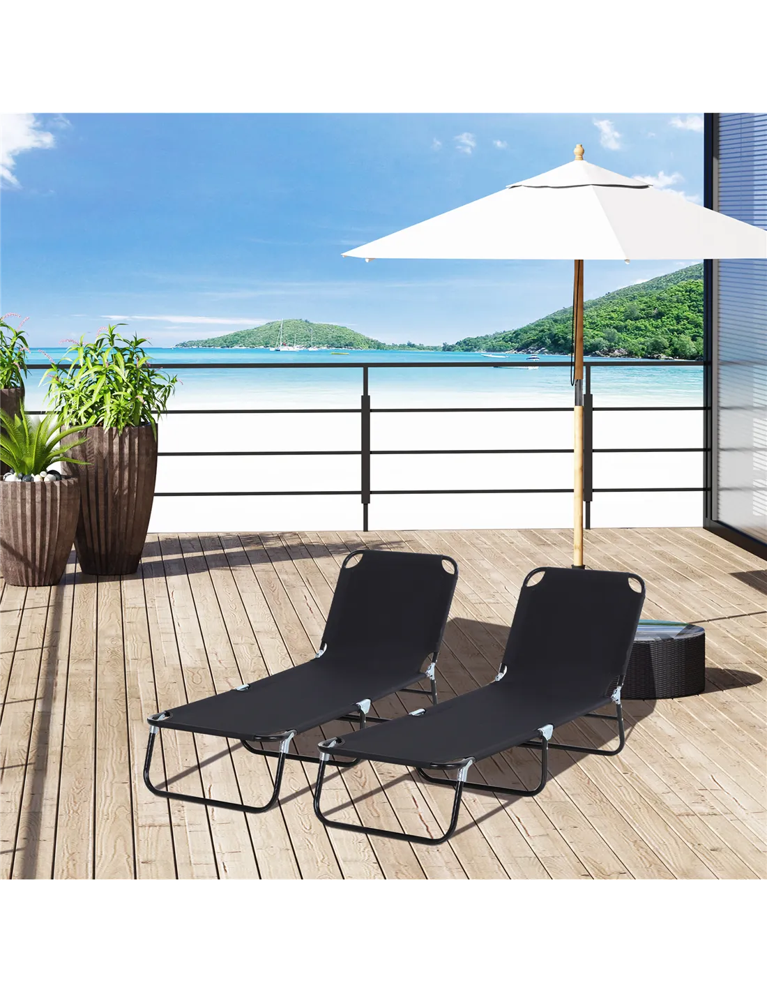 Our Outsunny folding sun lounger set is strong, comfortable and will support you all afternoon long. Reinforced metal frames keep you supported - fabric seats are fitted to keep you comfortable. Three long legs keep the lounger balanced. The back can be set to five different positions - choose a position you prefer best.