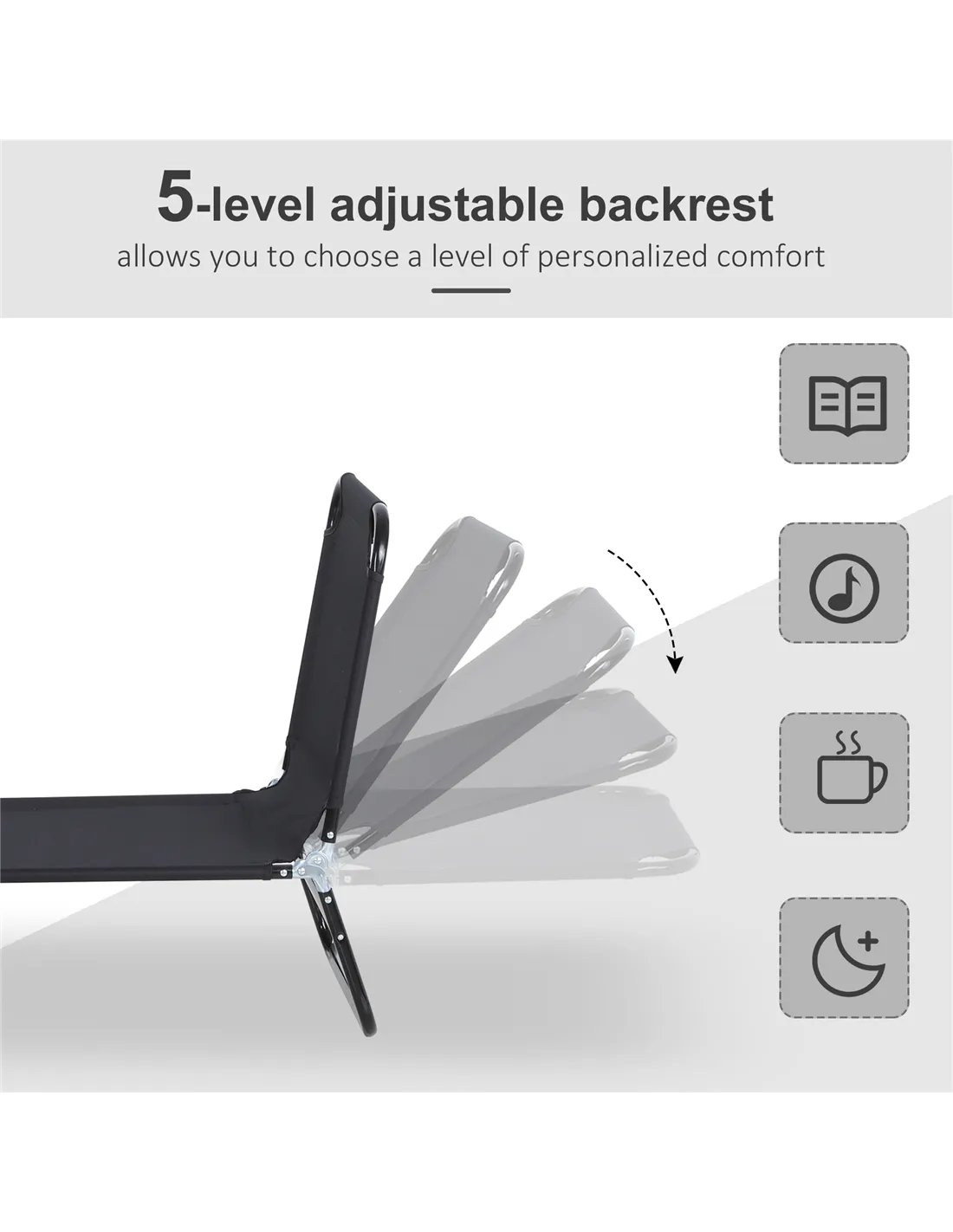 - Adjust the backrest to five different positions to find your preferred angle for sunbathing, reading, or napping outdoors.