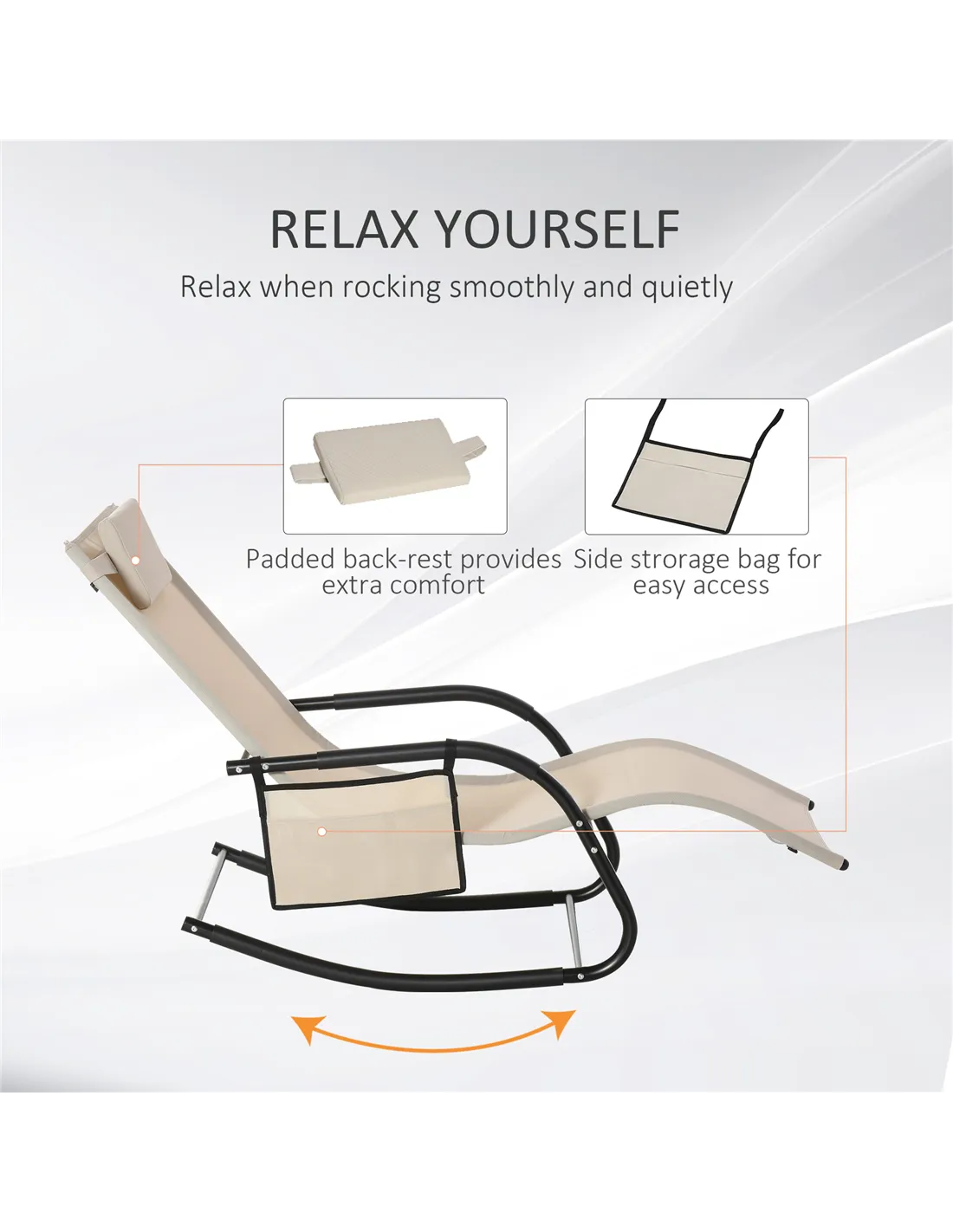 Outsunny 2PCs Outdoor Garden Rocking Chair, Patio Sun Lounger Rocker Chair with Breathable Mesh Fabric, Removable Headrest Pillow, Armrest, Side Storage Bag, Cream White