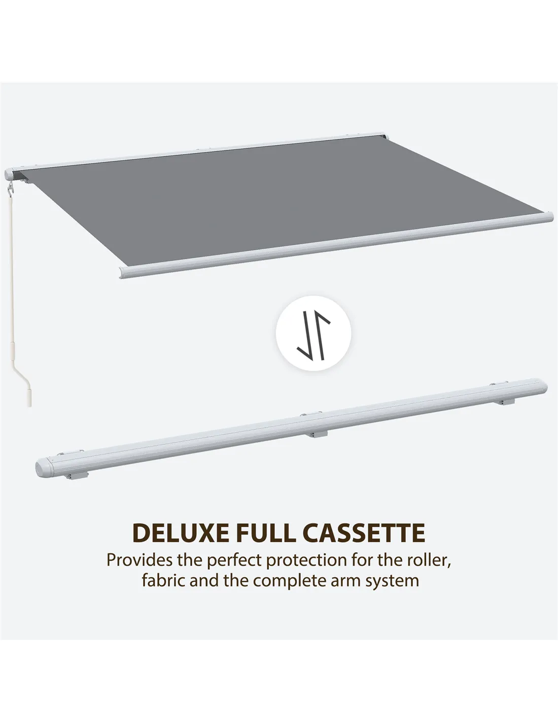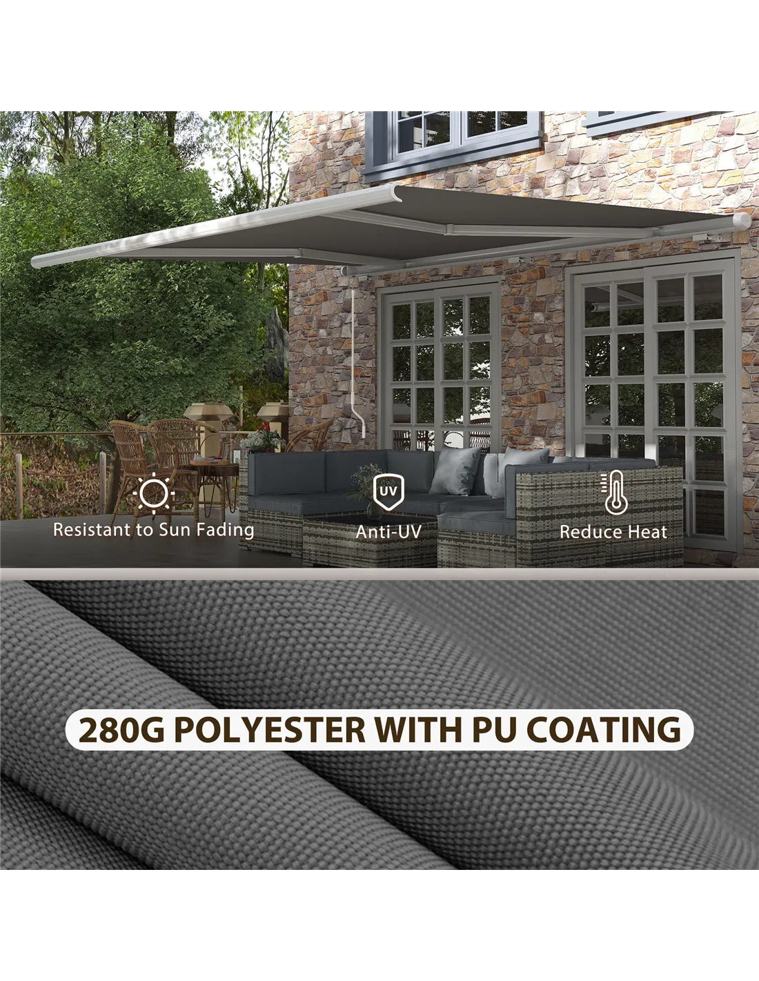 Provide cover for yourself outdoors instantly, with no fuss. Do it with Outsunny retractable awnings for patios. It also comes with LED strips so it can light up the area when dark. The frame is made from a blend of aluminium and metal, ensuring it is solid and reliable for use outdoors in all weather. The 280g/m² canopy has a PU coating to shelter from sun glare and mild weather.