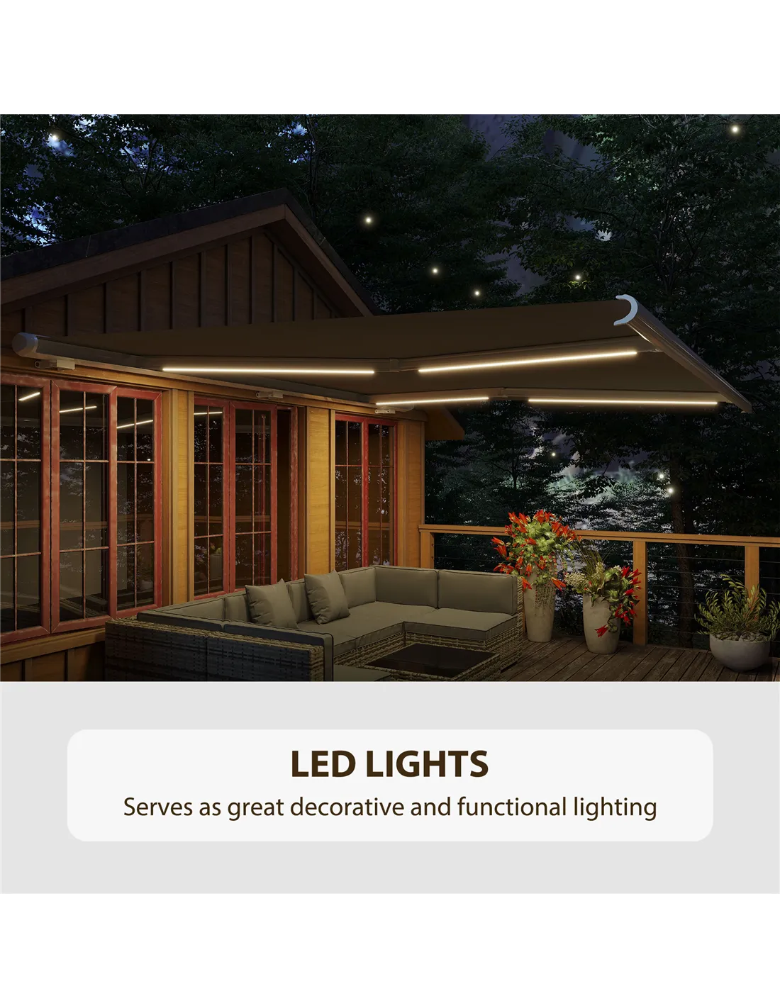 - The integrated LED lighting strip creates a cosy, illuminated outdoor space for evening gatherings or alfresco dining, extending the usability of your outdoor area after dusk.