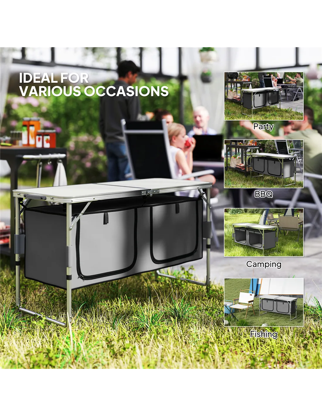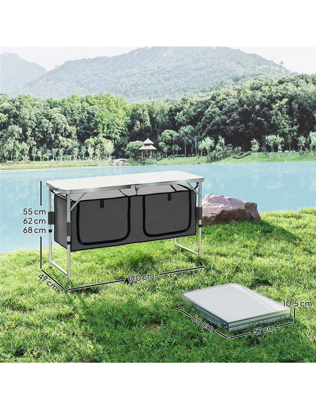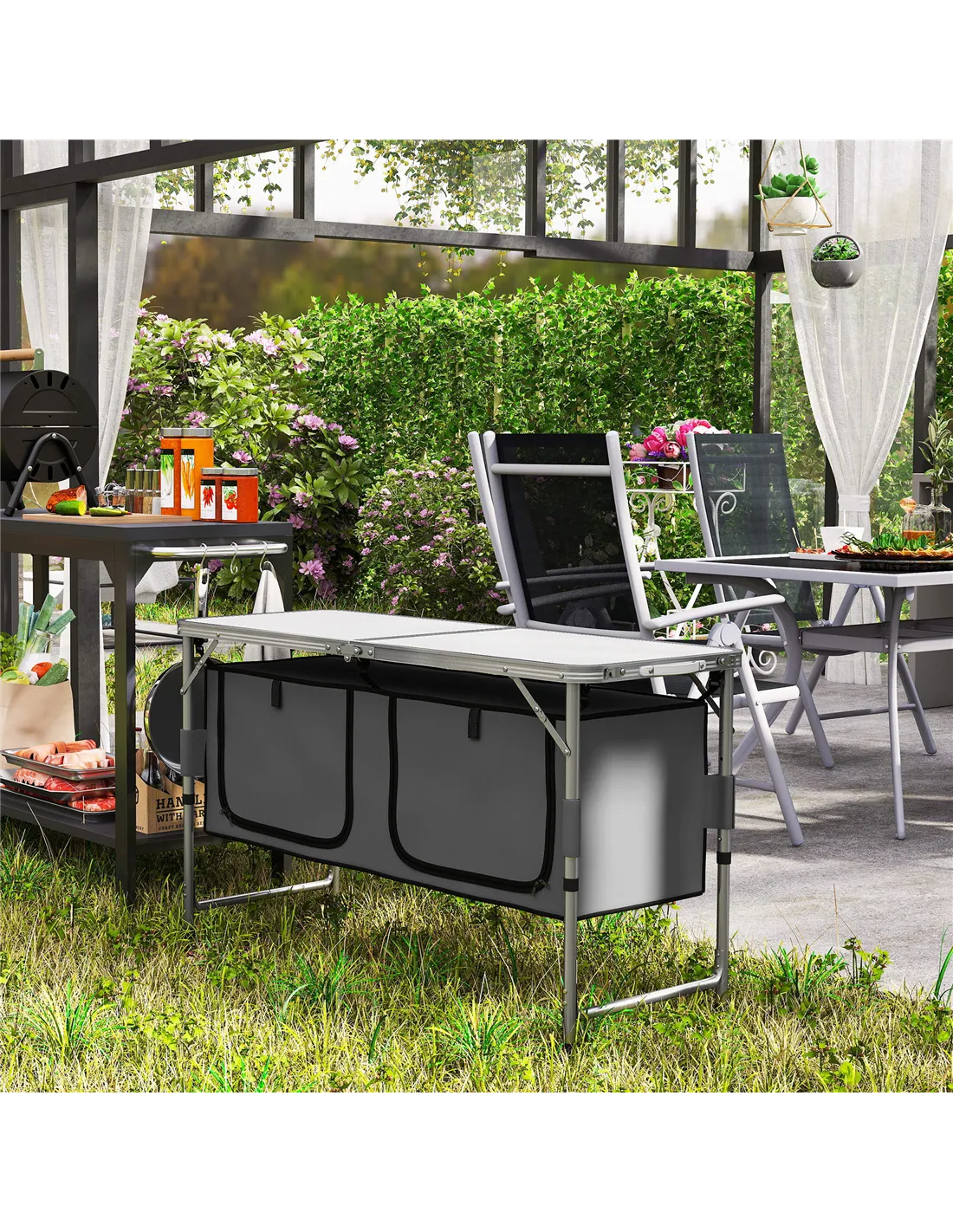 - Ideal for garden gatherings, this folding camping cupboard provides a practical surface for food preparation and serving during BBQ parties or outdoor celebrations.