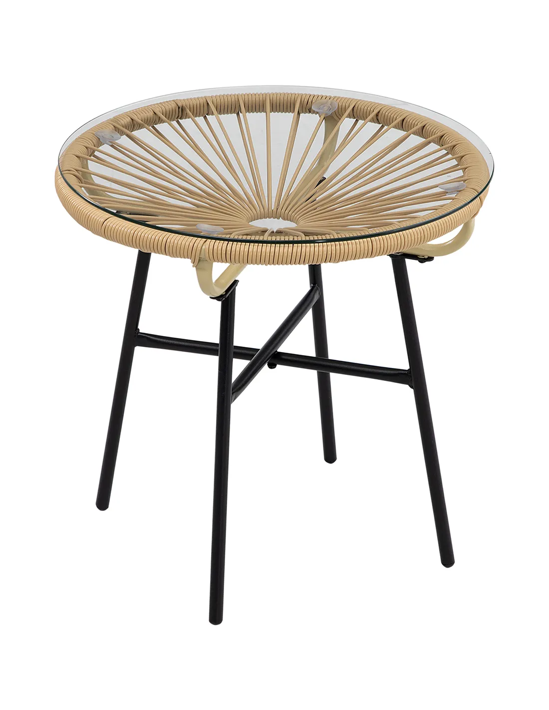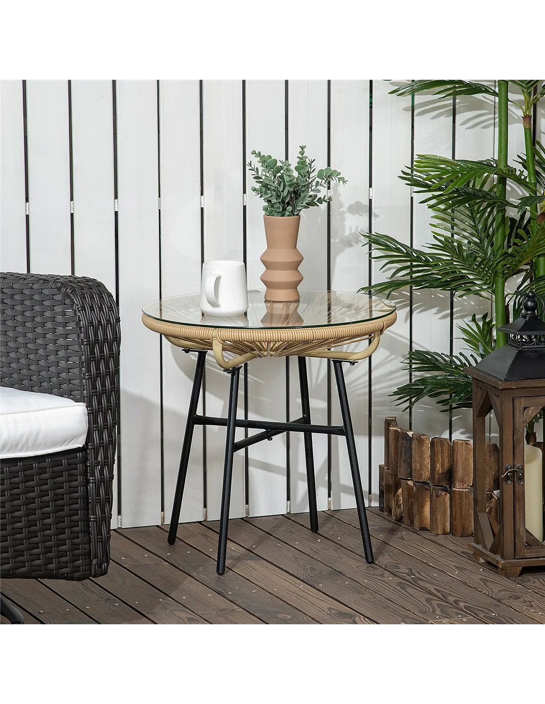 The rattan you know-but not like you've seen it: say hello to this cool and quirky outdoor side table from Outsunny. The top half is formed of two parts: there's a hollow base, vine wrapped in plastic wicker; the cool rattan design matches beautifully with your other garden furniture. A round glass top is fitted above, making it a safe resting place for holding items close by. A powder coated steel frame for a strong base, with protective foot pads to complete.