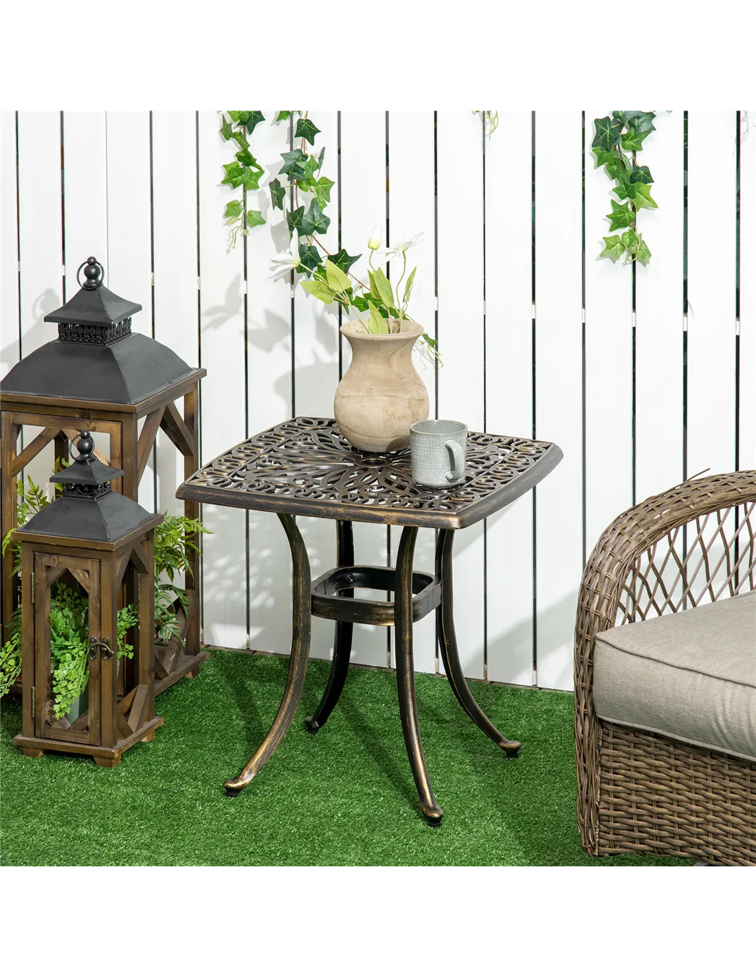 The Outsunny patio side table is a versatile addition to any outdoor space. Ideal for balconies, gardens, or patios, its compact 54 x 54cm surface provides ample room for drinks, snacks, or decorative items. The 38mm diameter umbrella hole allows you to easily fit a parasol, offering shade during sunny afternoons. Thanks to its sturdy cast aluminium frame and adjustable feet, it remains stable on uneven surfaces, making it perfect for alfresco dining or relaxing with a book. Its elegant bronze finish and floral cut-out design complement both modern and traditional outdoor settings, enhancing the ambience of your garden or terrace.