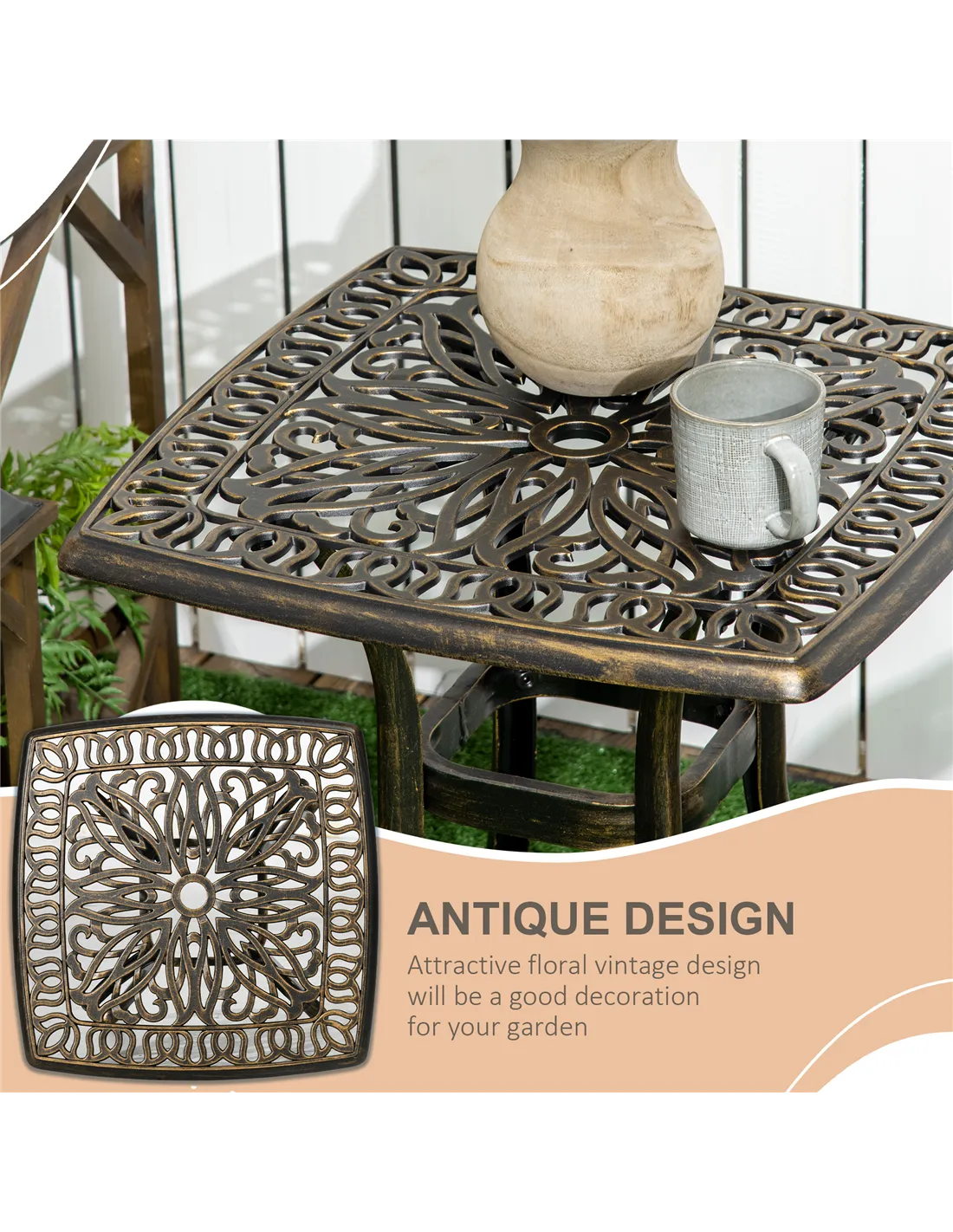 Sophisticated antique style for the garden - this Outsunny patio coffee table. Made from cast aluminium, this is a strong, sturdy piece which is suitable for outdoor use. A floral cut-out table top gives it a decorative feel, with the bronze-coloured finish bringing beauty. It features a 38mm centre hole to hold a parasol umbrella - keep shaded as you sit and relax when the sun is out.