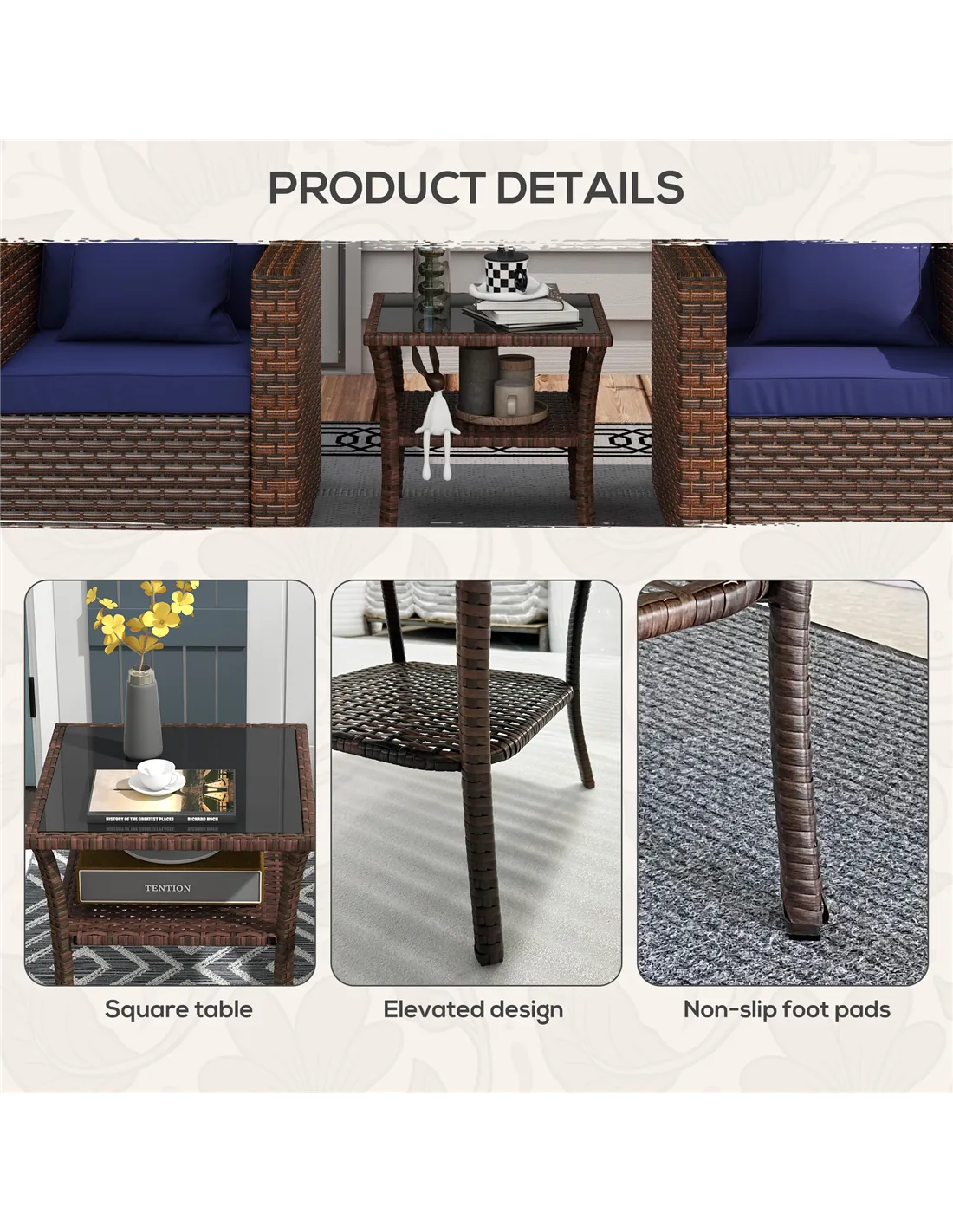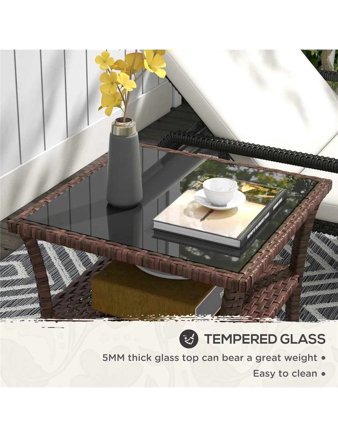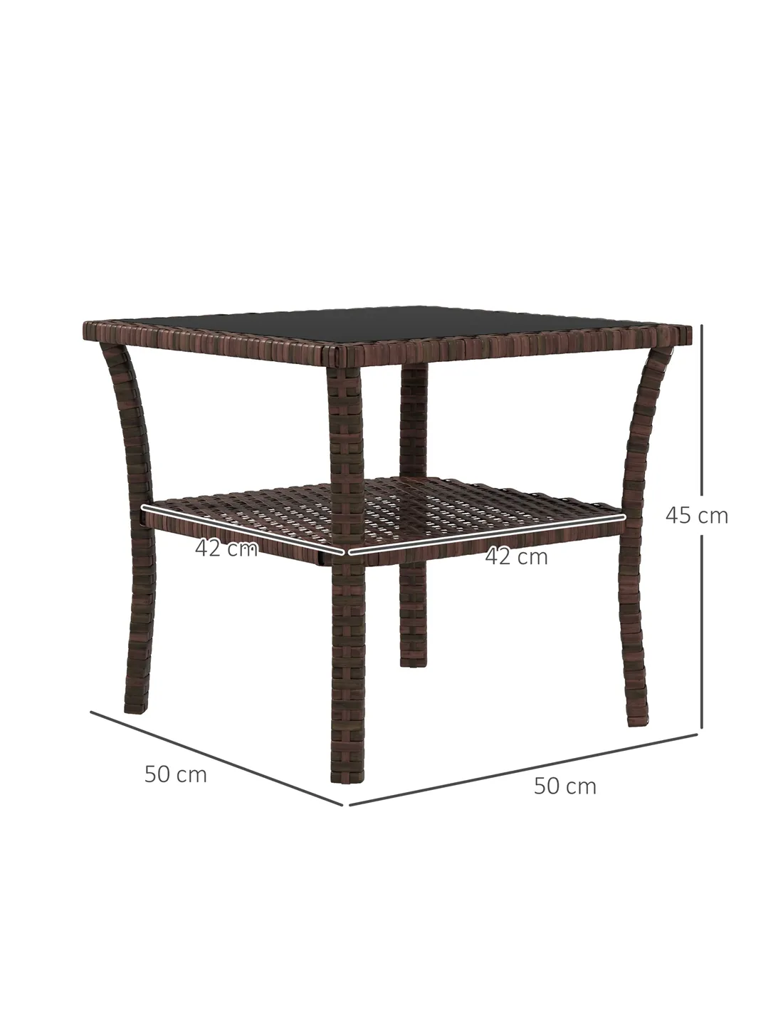 The Outsunny two-tier PE rattan square coffee table is an ideal addition to any British garden, patio, or conservatory. Its compact 50 x 50 cm size makes it perfect for intimate gatherings, whether enjoying morning tea or casual alfresco dining with friends and family. The tempered glass surface offers a smooth, easy-to-clean area for snacks and beverages, while the lower shelf provides convenient storage for magazines, garden tools, or decorative items. Thanks to its weather-resistant PE rattan and galvanised steel frame, this table withstands the UK’s variable climate, maintaining its stylish appearance throughout the seasons. It also complements a variety of outdoor furniture styles, from modern to classic, enhancing your outdoor living space effortlessly.