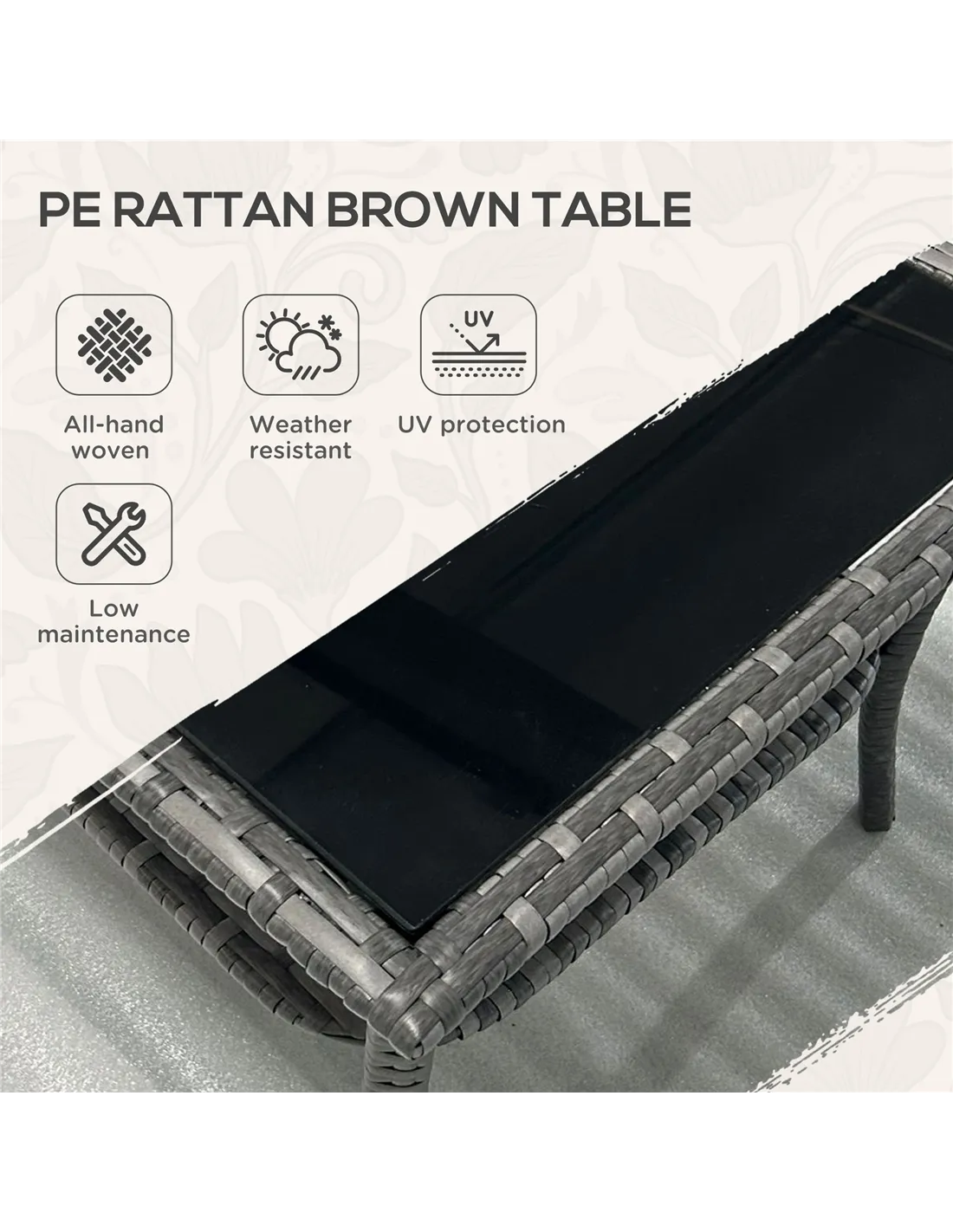 Blending on-trend rattan with a sleek glass top, this Outsunny four-seater garden coffee table is a striking piece for your outdoors. A powder coated steel frame for a strong and supportive core, the outer is wrapped in plastic wicker; offering double the durability and a garden-ready look. The tempered glass tabletop means a safe and solid dining surface which can be easily wiped clean. With a bottom shelf, you can also keep small pieces close altogether.