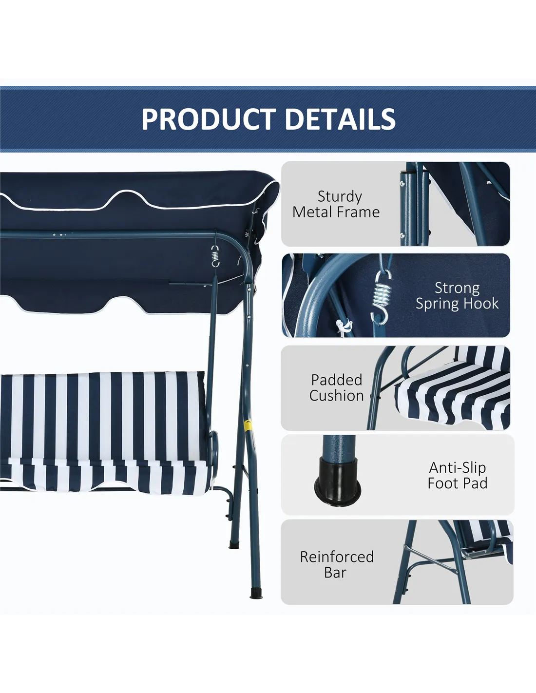 Outsunny 3 Seater Garden Swing Seat Chair Outdoor Bench with Adjustable Canopy and Metal Frame, Blue Stripes