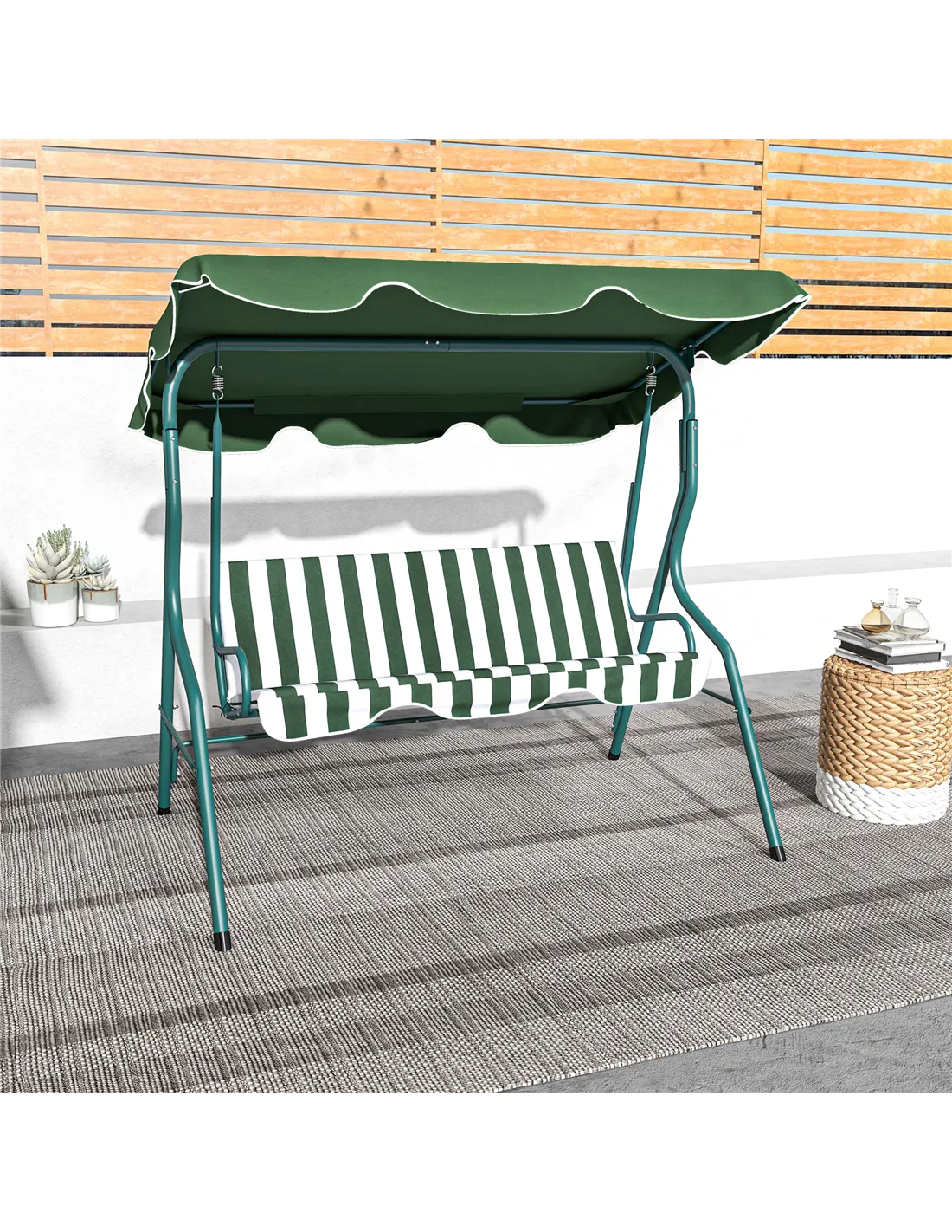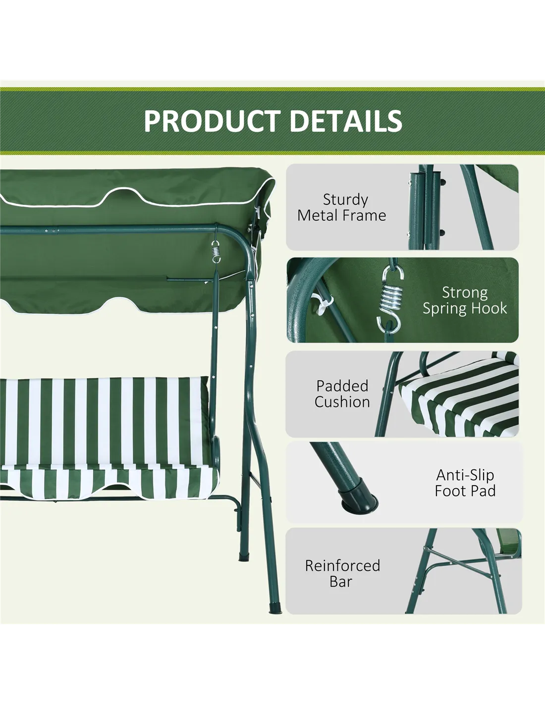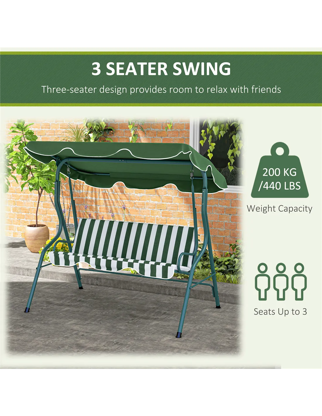 Outsunny 3 Seater Garden Swing Seat Chair Outdoor Bench with Adjustable Canopy and Metal Frame, Green Stripes