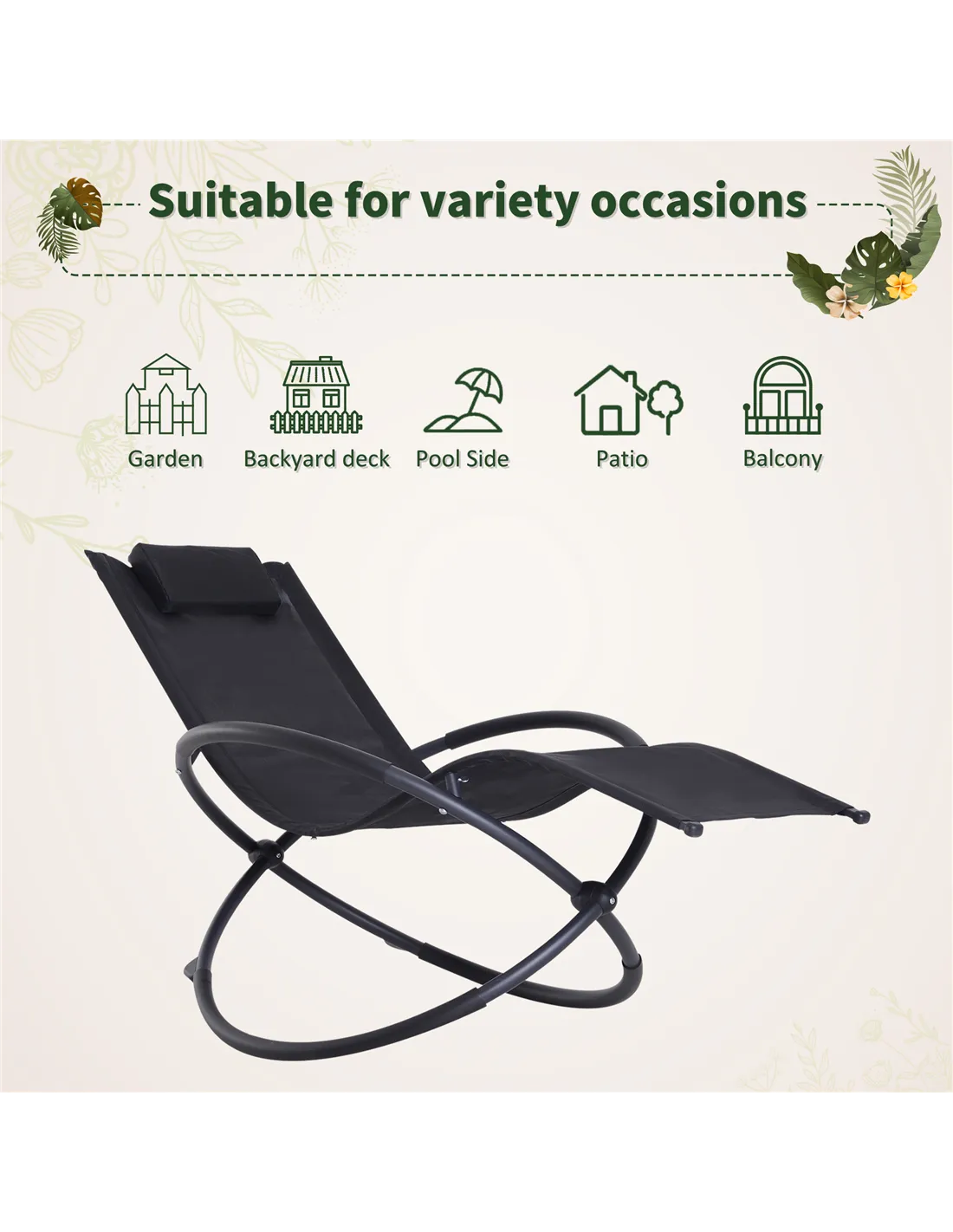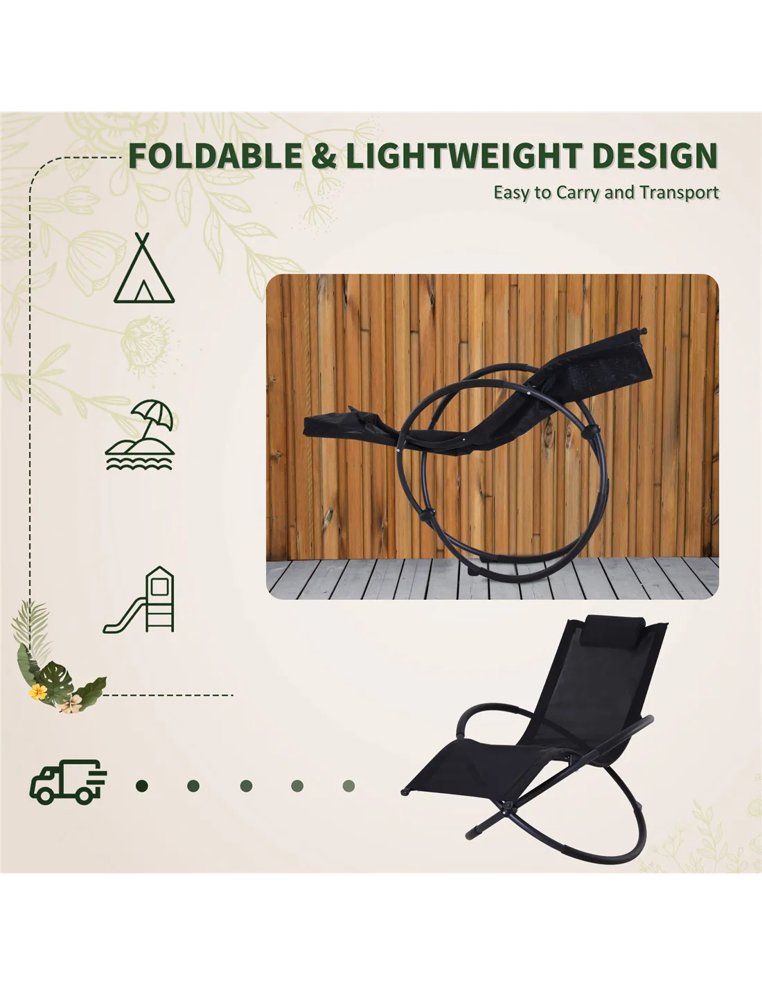 The Outsunny Outdoor Orbital Lounger offers versatile comfort for various outdoor settings. Ideal for your garden, patio, or balcony, it provides a relaxing spot to enjoy sunny afternoons or cool evenings. Thanks to its foldable design, it’s easy to transport, making it perfect for trips to the park, beach, or camping. The zero-gravity orbital shape evenly distributes your weight, reducing pressure points and enhancing relaxation whether you’re reading, sunbathing, or simply unwinding. The breathable, water and UV-resistant fabric ensures durability and comfort in all weather conditions, while the included head pillow adds extra support for extended lounging sessions.