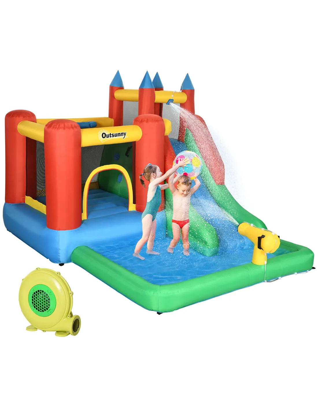 Outsunny Kids Inflatable Bouncy Castle Water Slide 6 in 1 Bounce House Jumping Castle Water Pool Gun Climbing Wall Basketball Hoop with Air Blower for Summer Playland