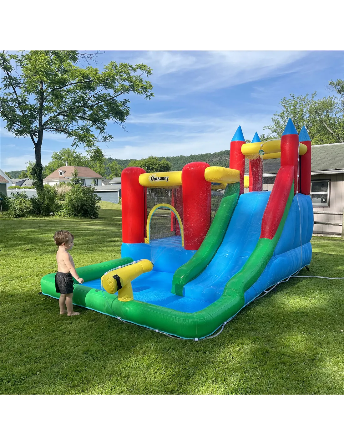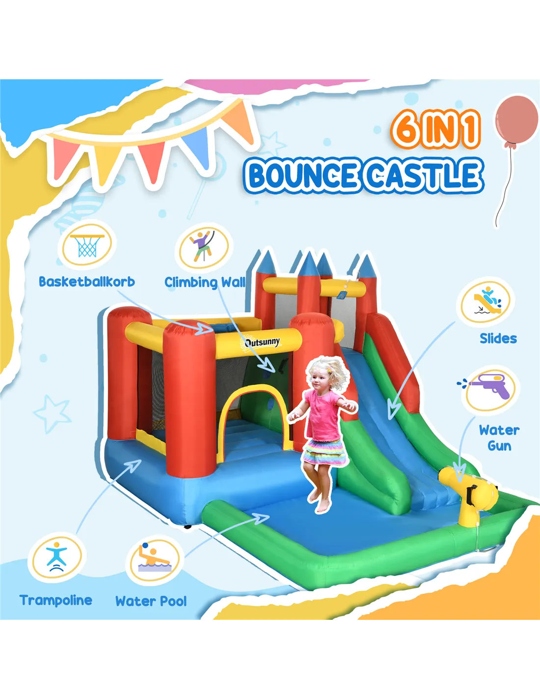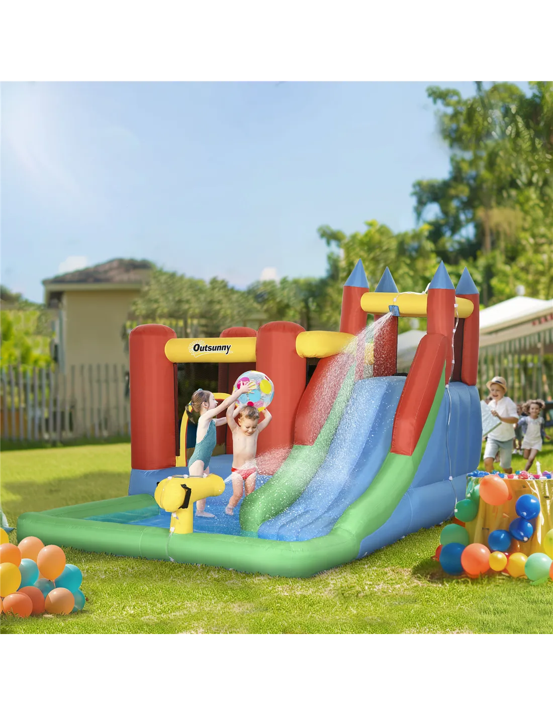 The Outsunny inflatable play centre is perfect for transforming your garden into a lively summer playground. Ideal for birthday parties, family gatherings, or simply keeping children entertained on warm days, this versatile unit combines a bouncy castle, water slide, climbing wall, and splash pool to offer a variety of activities in one compact setup. It comfortably accommodates up to four children aged 3 to 8 years, encouraging active play and social interaction. The included water gun and basketball hoop add extra layers of fun, making it a fantastic choice for outdoor play during the British summer months. Thanks to the electric air blower, setup is quick and hassle-free, allowing you to enjoy more time watching the kids have fun.