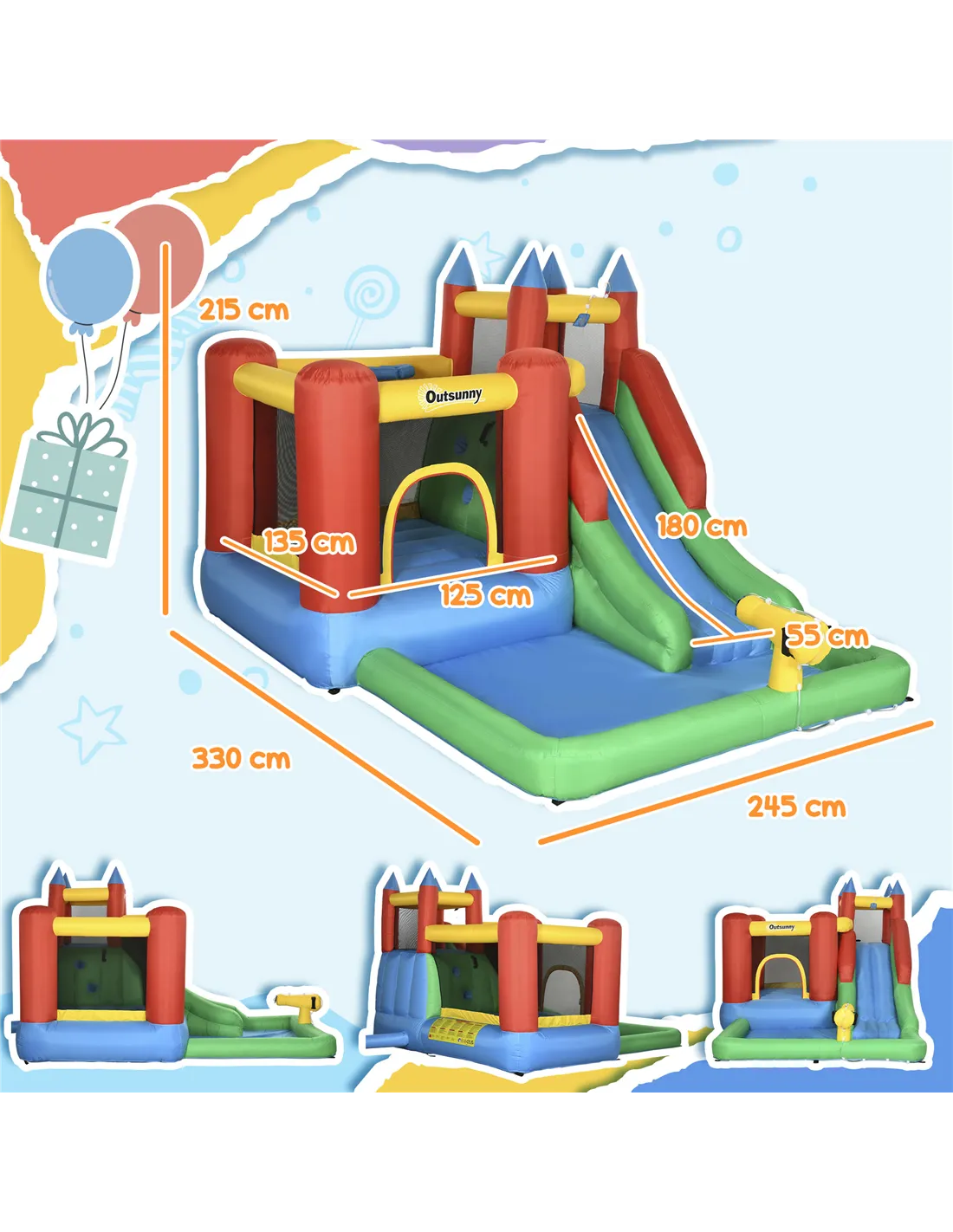 - Dimensions: 215H x 330L x 245Wcm. Trampoline: 135L x 125Wcm. Pool: 200L x 150W x 18Hcm. Slide: 180L x 55Wcm