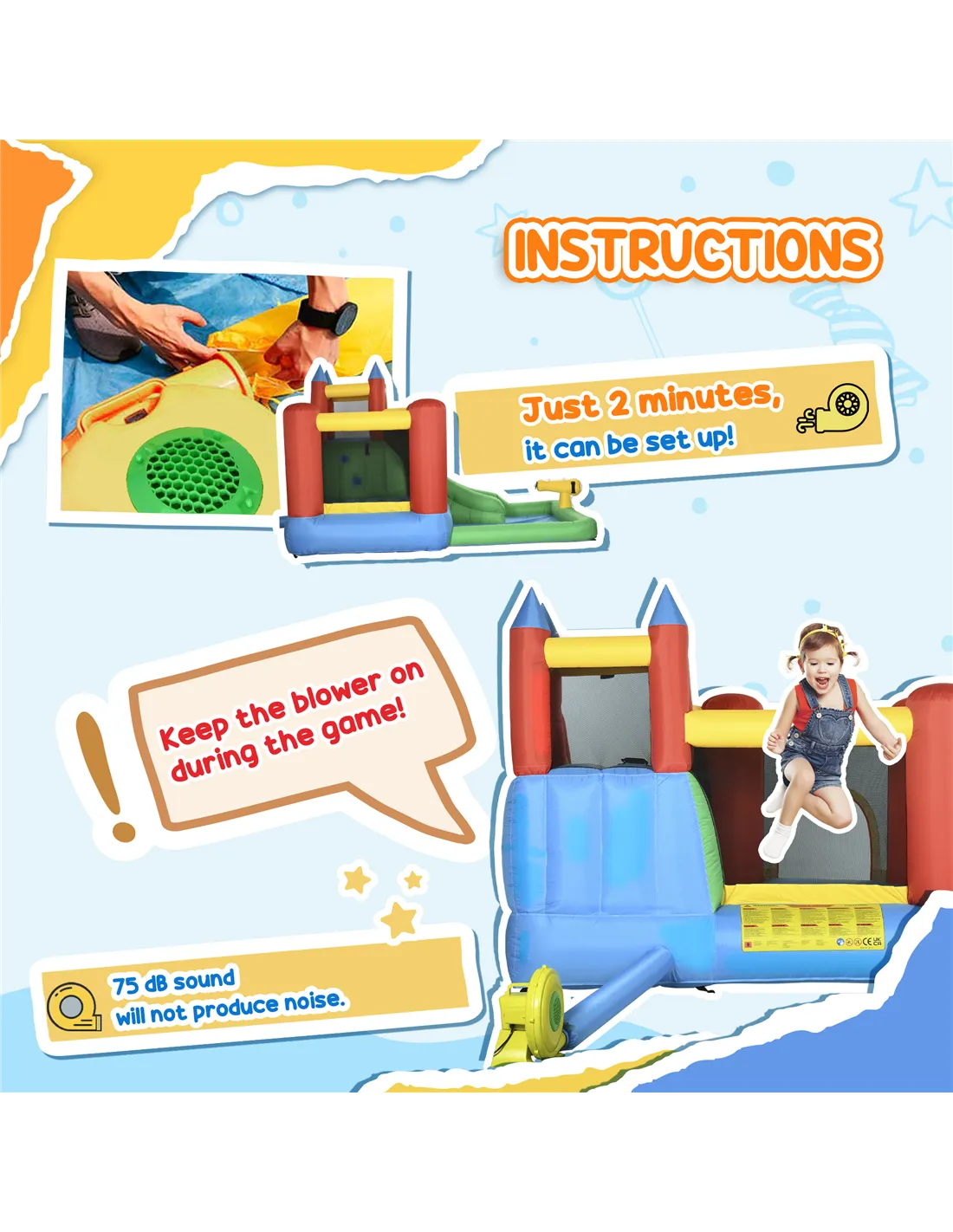 - 450w blower makes the bouncy castle up in two minutes