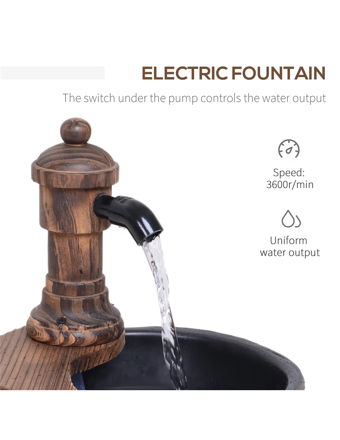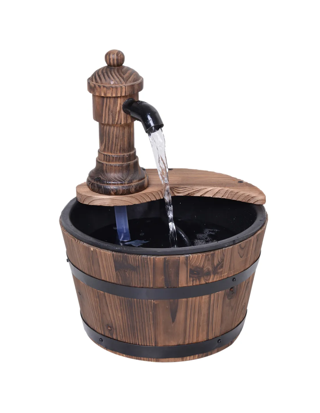 - Retro styled wood barrel fountain pump adds a unique touch to your garden and outdoor areas