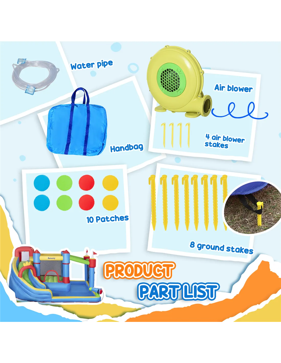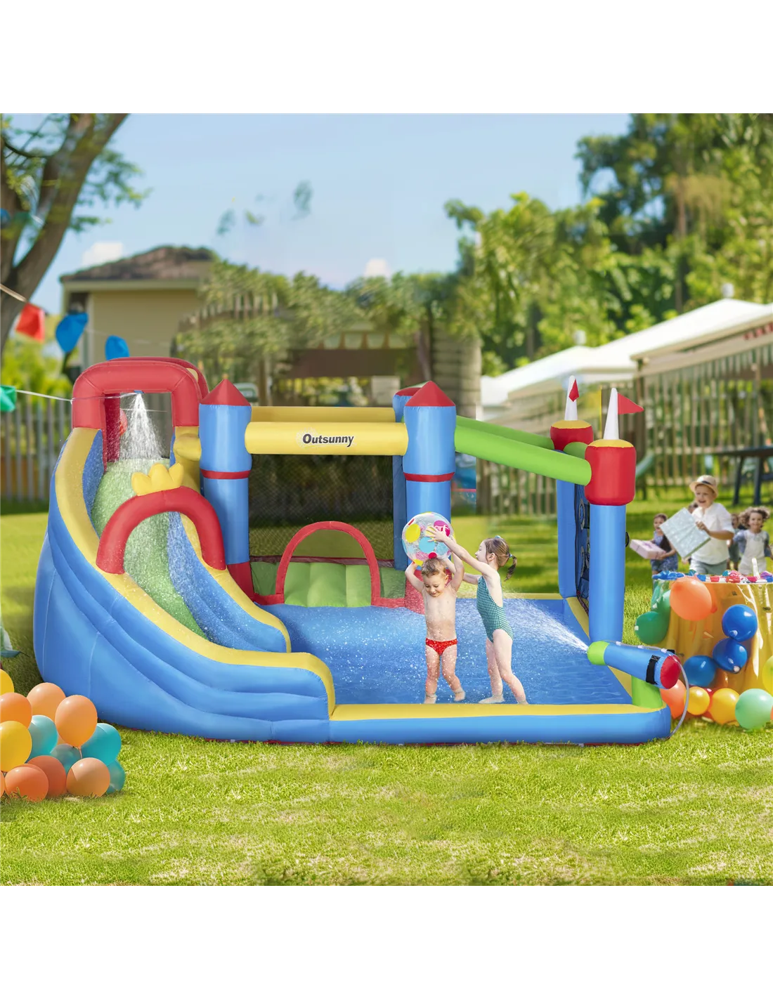 Bring the fun of a fairground and waterpark to your garden with this Outsunny inflatable bouncy castle – a wonderful outdoor play upgrade. Packed with exciting features like a slide, pool, climbing wall and more, it's designed for non-stop fun and adventure. With room for up to three children, it's great for parties and playdates. Secured with ground stakes and made from strong material, it's a vibrant, safe space where kids can bounce, laugh and make lasting memories.