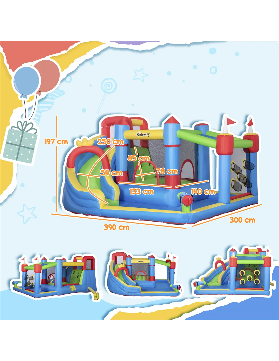 Based on reviews from UK customers, the Outsunny inflatable castle is praised for its robust construction and vibrant design, which keeps children entertained for hours. Parents appreciate the safety features such as the surrounding net and ground stakes, ensuring peace of mind during play. Many highlight the ease of inflation and deflation, thanks to the powerful 450W blower. The multi-activity setup, including the water slide and climbing wall, is often mentioned as a key attraction that encourages physical activity and imaginative play. Overall, users recommend this product for its quality, versatility, and value for money.