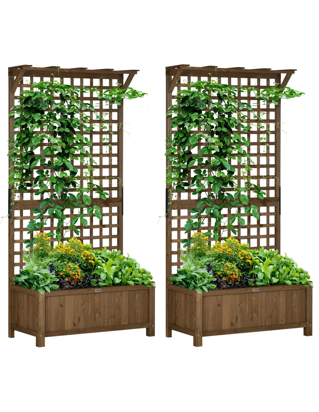 Outsunny 2 Pcs Raised Bed with Drainage Holes, Wood Planter with Trellis for Climbing Plants to Grow Vegetables, Flowers, Brown