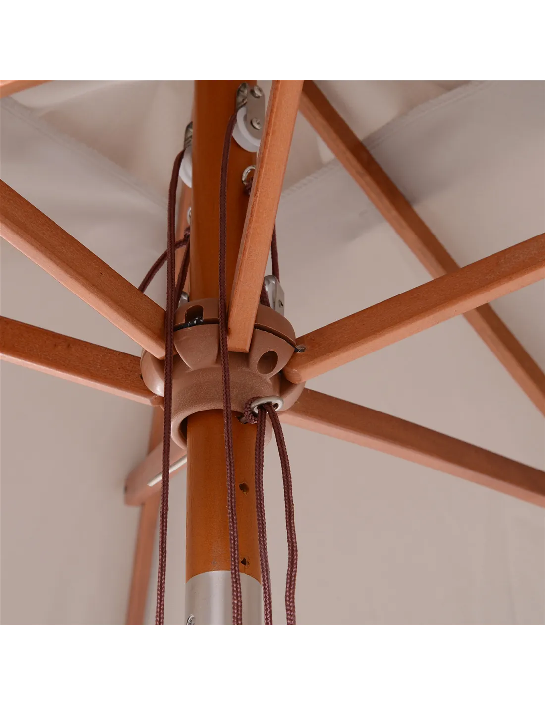 Protect yourself outdoors in ultimate style with this Outsunny 2m parasol. The 180g polyester canopy provides plenty of sun protection, and the angle can be adjusted - keep shaded throughout the day. The fir wood structure means a strong and beautiful core, with eight bamboo ribs underneath the canopy for extra support. It's finished with a pull rope to open and close the canopy easily.