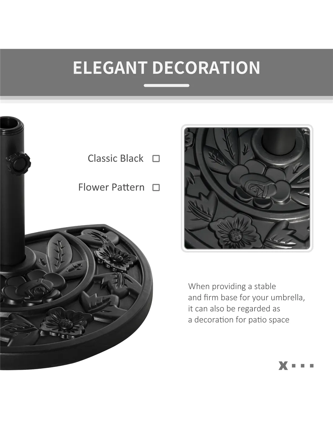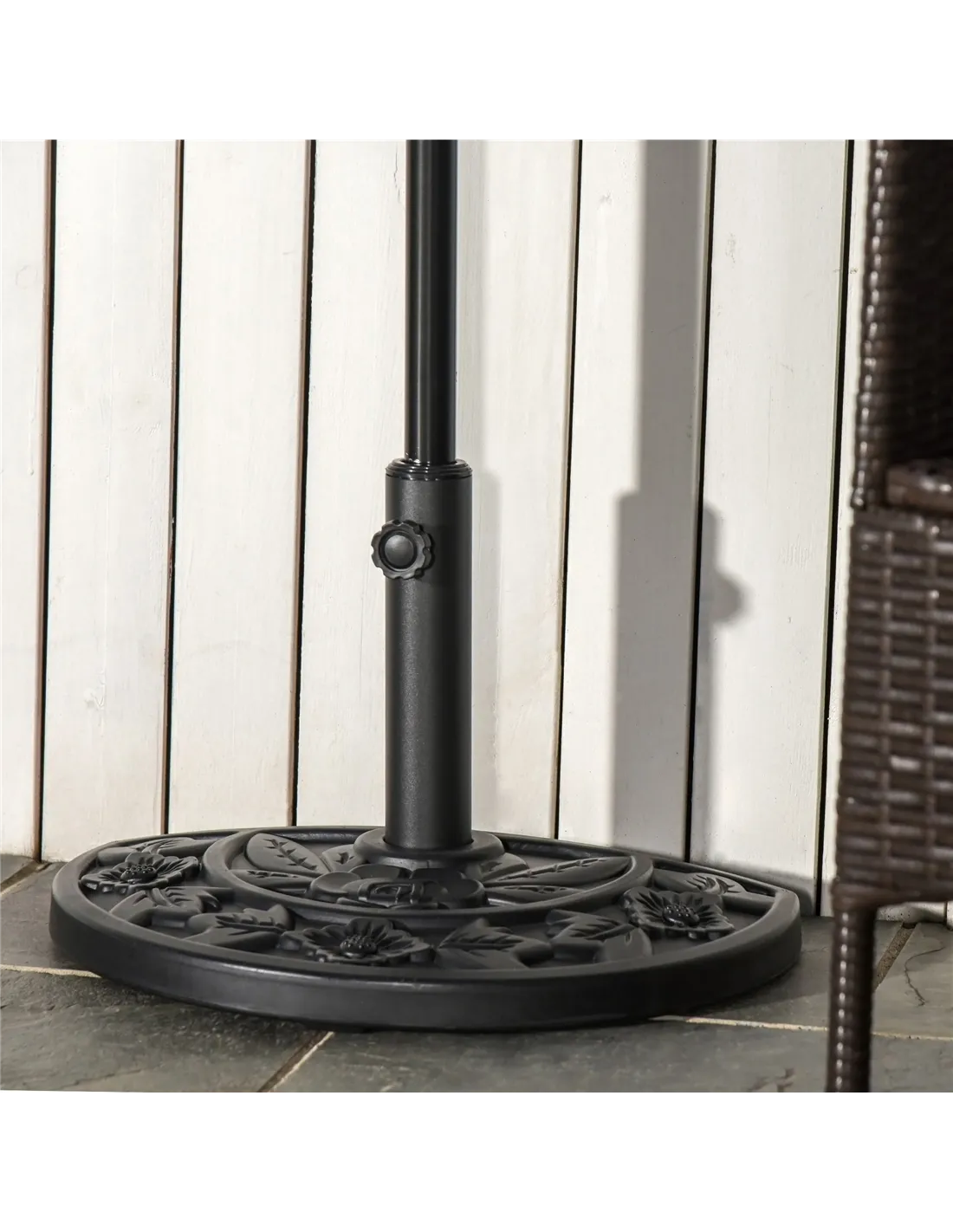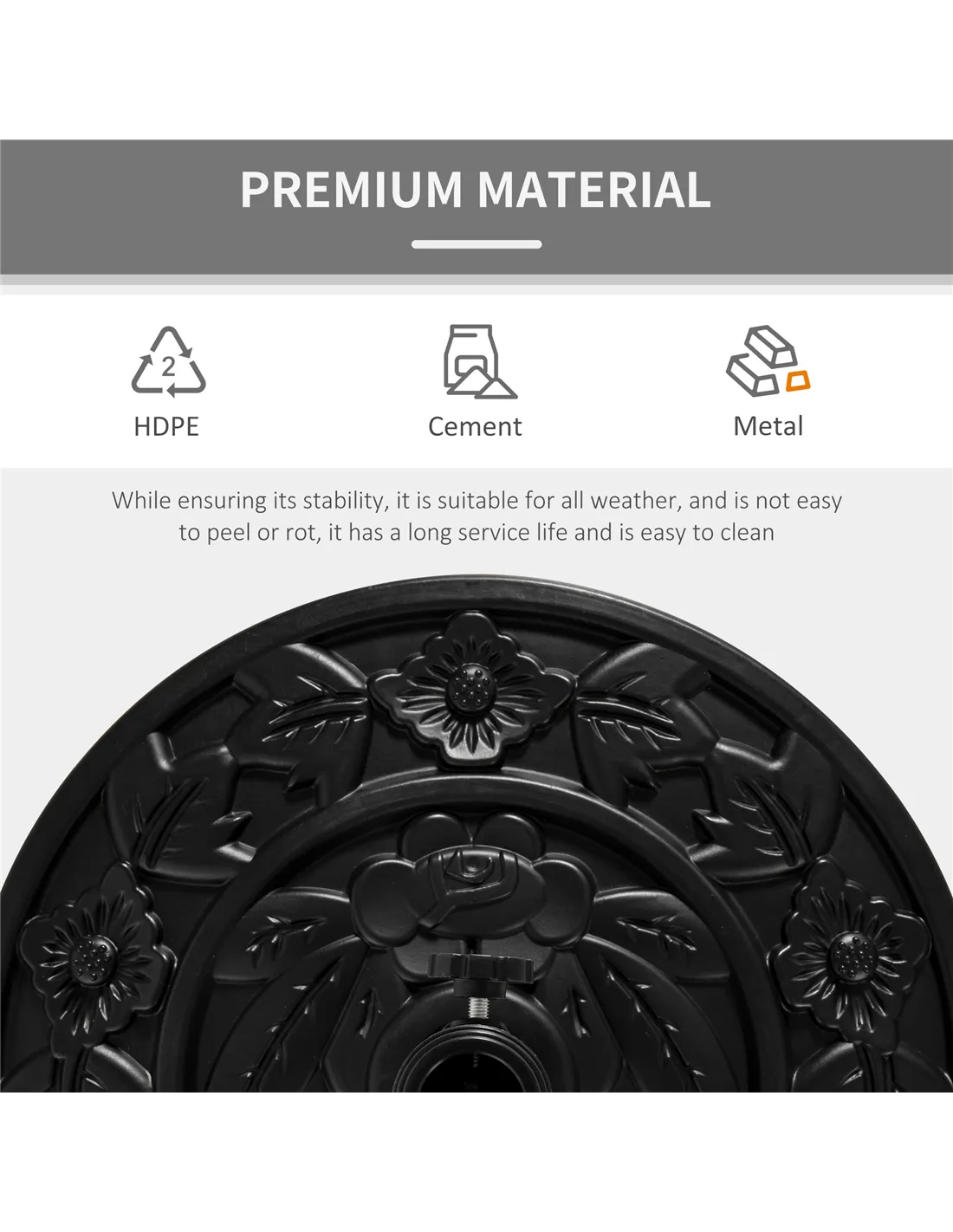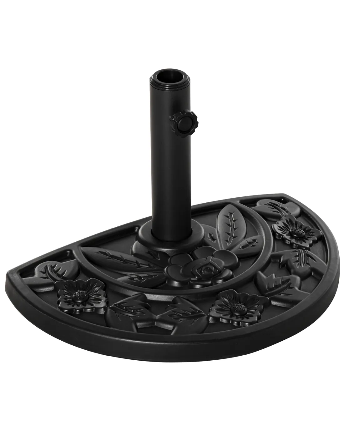 Incorporate elegance into your garden furniture with this half parasol umbrella base from Outsunny. Made from a blend of HDPE, cement and metal and weighing 9kg, it can withstand heavy rain and wind conditions, making it suitable for use all year round. In a versatile black hue, it features a top engraved with a delicate and beautiful flower design and it is finished with a tightening screw to hold the parasol pole securely in place all day long. It’s the perfect combination of beauty and functionality.