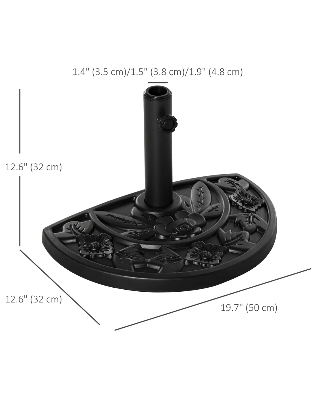 The Outsunny half round parasol base is an ideal solution for securing your garden umbrella with style and stability. Perfectly suited for patios, balconies, or outdoor seating areas, it complements various garden décors thanks to its sleek black finish and subtle floral engraving. Its adjustable coupler accommodates umbrella poles with diameters of 3.5cm, 3.8cm, and 4.8cm, making it versatile for most standard parasols. Whether you’re enjoying a sunny afternoon tea or hosting an outdoor gathering, this sturdy base ensures your parasol remains firmly in place, even in breezy conditions. Its compact design fits neatly against walls or railings, optimising space without compromising on support.